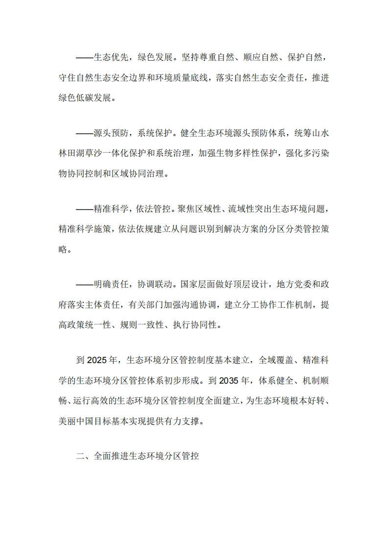 中共中央办公厅国务院办公厅关于加强生态环境分区管控的意见(2024年3月6日)生态环境分区管控是以保障生态功能和改善环境质量为目标,实施分区域差异化精准管控的环境管理制度,是提升生态环境治理现代化水平的重要举措。实施生态环境分区管控,严守生态保护红线、环境质量底线、资源利用上线,科学指导各类开发保护建设活动,对于推动高质量发展,建设人与自然和谐共生的现代化具有重要意义。为加强生态环境分区管控,经党中央、国务院同意,现提出如下意见。一、总体要求加强生态环境分区管控,要坚持以习近平新时代中国特色社会主义思想特别是习近平生态文明思想为指导,深入贯彻党的二十大精神,落实全国生态环境保护大会部署,完整、准确、全面贯彻新发展理念,加快构建新发展格局,协同推进降碳、减污、扩绿、增长,充分尊重自然规律和区域差异,全面落实主体功能区战略,充分衔接国土空间规划和用途管制,以高水平保护推动高质量发展、创造高品质生活,努力建设人与自然和谐共生的美丽中国。