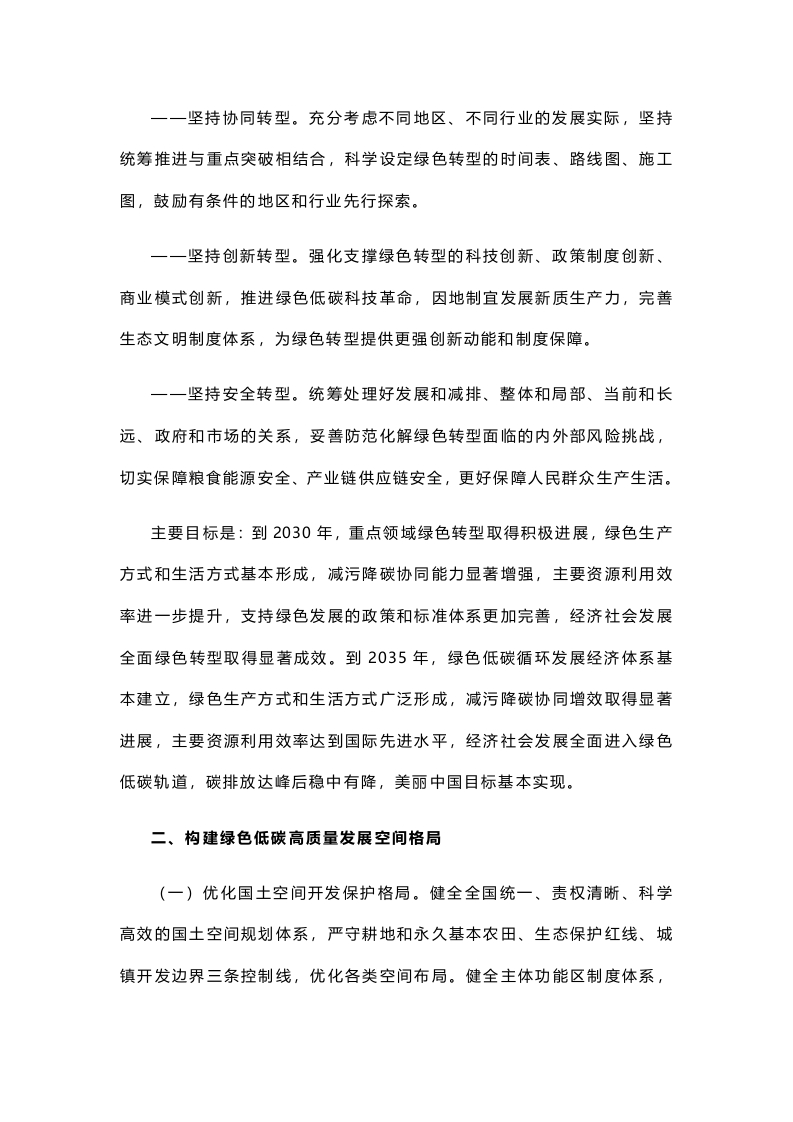中共中央国务院关于加快经济社会发展全面绿色转型的意见(2024年7月31日)推动经济社会发展绿色化、低碳化,是新时代党治国理政新理念新实践的重要标志,是实现高质量发展的关键环节,是解决我国资源环境生态问题的基础之策,是建设人与自然和谐共生现代化的内在要求。为加快经济社会发展全面绿色转型,现提出如下意见。一、总体要求坚持以习近平新时代中国特色社会主义思想为指导,深入贯彻党的二十大和二十届二中、三中全会精神,全面贯彻习近平经济思想、习近平生态文明思想,完整准确全面贯彻新发展理念,加快构建新发展格局,坚定不移走生态优先、节约集约、绿色低碳高质量发展道路,以碳达峰碳中和工作为引领,协同推进降碳、减污、扩绿、增长,深化生态文明体制改革,健全绿色低碳发展机制,加快经济社会发展全面绿色转型,形成节约资源和保护环境的空间格局、产业结构、生产方式、生活方式,全面推进美丽中国建设,加快推进人与自然和谐共生的现代化。工作中要做到:一一坚持全面转型。牢固树立绿水青山就是金山银山的理念,将绿色转型的要求融入经济社会发展全局,全方位、全领域、全地域推进绿色转型,构建人与自然生命共同体。