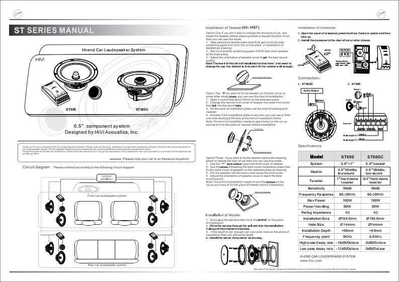 ST SERIES MANUAL二.离音喇机安装(K3X-165T):可:分须器安装:当然商活女如不架改莹年曲椅,清高奇空击在发麦鱼前方道布门上两州器致程经路尖贸.物国商上缓超库自高的弱一金餐护任去峰:然后亮南眼附在选宽的位置Hiend Car Loudspeaker System武种万武忧有在于可日完全不对车进行应变,明点是不能调军四地图宠两言HVi五。接线:1.5T000安装方文二,弃高安装在车门它隐的位,可,5T00STE00STE00C6.5”component systemDesigned by HiViAcoustics,Inc.春利人N玄见家动内票道用感西酒系线,为了快于家的内贝使用,有有端写车折西。山务动安需文朝,甲宝年通规了到摆型中梨速章W,事不眼果要想牢图地将商言安装有位自前方或车门歧,可以六规:请特别进意您的汽车处于想火状恋引设服零将安是证缸京过后盖,安最板,特高音南飘的骨领景在显号sT600ST600C一:线晴置:清调察下感围走澳入后盖内:压紧系统相65"+1"6.5网轴中低音65中低音65中低音离音1"球球项离音3/4"球球顶离音灵敏度g0u日90u日额率响应50-200Hz50-20KH2最大功率100W100W额定功率SOWSOW三,低音喇机安装:额定阻抗4040安装尼寸Q156.5mma156.5mm开孔尼寸@144mm@144mm安装深度≥65mm365mm分须点SKH位6.5KH位高通来减料率-18dB/Oetaveed日0 ctave0000低海衰减斜率-12d日0 ctaveCd日Odave重后车用总唐客系胡www.hi.com