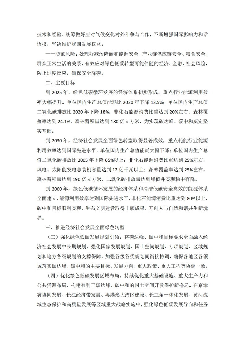 中共中央国务院关于完整准确全面贯彻新发展理念做好碳达峰碳中和工作的意见(2021年9月22日)实现碳达峰、碳中和,是以习近平同志为核心的党中央统筹国内国际两个大局作出的重大战略决策,是着力解决资源环境约束突出问题、实现中华民族永续发展的必然选择,是构建人类命运共同体的庄严承诺。为完整、准确、全面贯彻新发展理念,做好碳达峰、碳中和工作,现提出如下意见。一、总体要求(一)指导思想。以习近平新时代中国特色社会主义思想为指导,全面贯彻党的十九大和十九届二中、三中、四中、五中全会精神,深入贯彻习近平生态文明思想,立足新发展阶段,贯彻新发展理念,构建新发展格局,坚持系统观念,处理好发展和减排、整体和局部、短期和中长期的关系,把碳达峰、碳中和纳入经济社会发展全局,以经济社会发展全面绿色转型为引领,以能源绿色低碳发展为关键,加快形成节约资源和保护环境的产业结构、生产方式、生活方式、空间格局,坚定不移走生态优先、绿色低碳的高质量发展道路,确保如期实现碳达峰、碳中和。(二)工作原则实现碳达峰、碳中和目标,要坚持“全国统筹、节约优先、双轮驱动、内外畅通、防范风险”原则。一一全国统筹。全国一盘棋,强化顶层设计,发挥制度优势,实行党政同责,压实各方责任。根据各地实际分类施策,鼓励主动作为、率先达峰。一一节约优先。把节约能源资源放在首位,实行全面节约战略,持续降低单位产出能源资源消耗和碳排放,提高投入产出效率,倡导简约适度、绿色低碳生活方式,从源头和入口形成有效的碳排放控制阀门。一一双轮驱动。政府和市场两手发力,构建新型举国体制,强化科技和制度创新,加快绿色低碳科技革命。深化能源和相关领域改革,发挥市场机制作用,形成有效微励约束机制。一一内外畅通。立足国情实际,统筹国内国际能源资源,推广先进绿色低碳