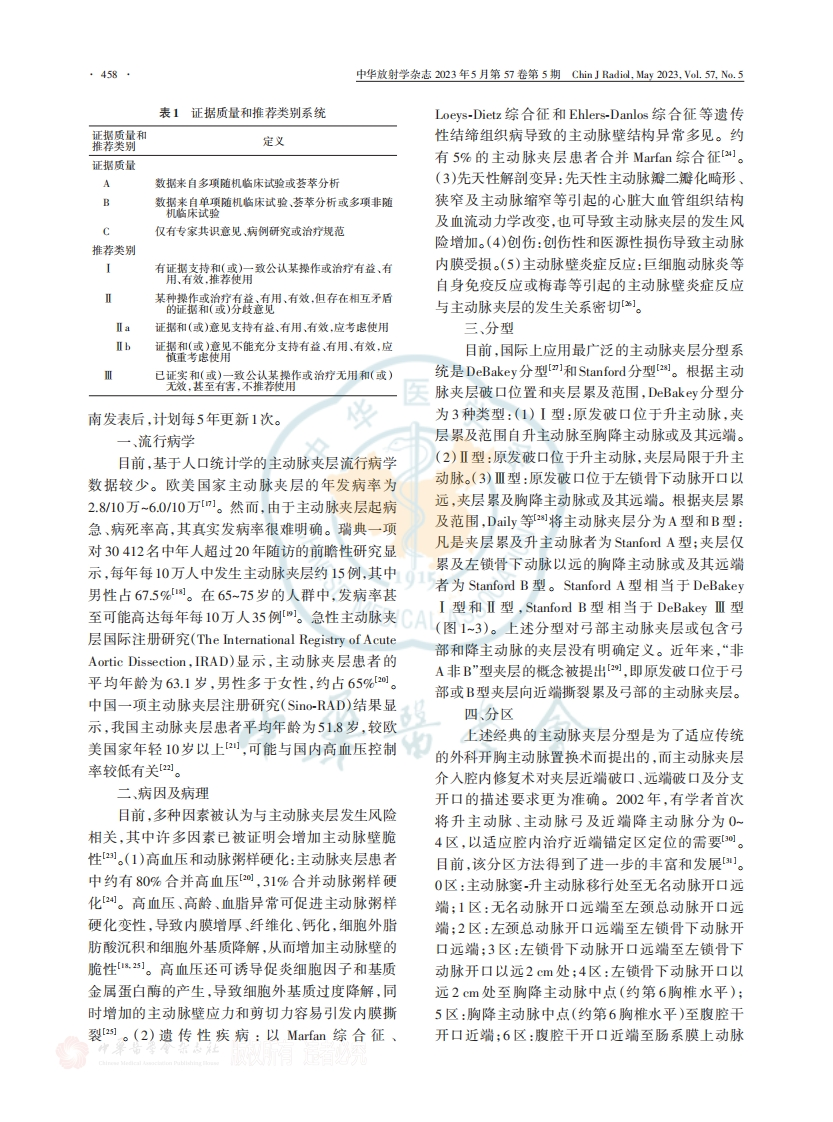 中华放射学杂志2023年5月第57卷第5期Chin J Radiol,May2023.Vol.57,Na.5·457··规范与共识·中国Stanford B型主动脉夹层影像诊断和介入治疗临床指南中华医学会放射学分会介入学组通信作者:郑传胜,华中科技大学同济医学院附属协和医院放射科,武汉430022,Email:hqzcsxh@sina.com【摘要】Stanford B型主动脉夹层(TBAD)是一种急危重症心血管疾病,及时有效的诊断及治疗极为重要。影像学在TBAD的诊疗中发挥着关键作用,但目前我国缺乏TBAD影像诊断临床应用指南。介人治疗已成为TBAD的主要治疗方式,但在不同分型、分期、分类中的治疗仍缺乏标准。为此,中华医学会放射学分会介入学组组织专家共同编写了《中国Stanford B型主动脉夹层影像诊断和介入治疗临床指南》,内容包括概述、主动脉夹层的诊断、治疗、围手术期管理、术后常见并发症的预防及处理、随访管理等,旨在提高行业对TBAD的认识,促进我国TBAD的诊疗向更加专业、规范的方向发展。【关键词】放射学,介入性;主动脉夹层;指南基金项目:国家自然科学基金(81873919)Clinical guidelines for imaging diagnosis and interventional treatment of Stanford type Baortic dissection in ChinaInterventional Group of Chinese Society of Radiology Chinese Medical AssociationCorresponding author:Zheng Chuansheng,Department of Radiology,Union Hospital,Tongji MedicalCollege,Huazhong University of Science and Technology,Wuhan 430022,China,Email:hqzcsxh@sina.com概述了极大丰富和广泛应用,并产生了许多循证医学证据,尤其是基于中国病例特点的研究证据4]。鉴主动脉夹层是由各种原因导致的主动脉内膜口于此,中华医学会放射学分会介入学组组织全国主出现破口,血液由内膜破口进入中层并沿主动脉纵动脉夹层介入及相关领域多学科专家,根据目前轴撕裂,使主动脉被分隔为真、假两腔的病理过TBAD临床研究的最新进展,结合临床实践,围绕程。Stanford B型主动脉夹层(type B aorticTBAD的影像诊断和介入治疗讨论并制定形成《中dissection,TBAD)占所有主动脉夹层的25%~国Stanford B型主动脉夹层影像诊断和介入治疗临40%四,具有起病急、进展快、病死率高的特点,是一床指南》(以下简称指南)。本指南评价治疗或筛查种危急重症心血管疾病。自1999年Dake等首次的证据质量和推荐级别,采用欧洲心脏病协会报道使用腔内修复术治疗TBAD以来,TBAD的治(European Society of Cardiology,ESC)指南制定建疗方式由传统外科手术转为微创介入治疗,围手术议推荐的分级标准(表1)[。本指南已在国际实期病死率及并发症发生率明显降低。经过二十余践指南注册平台(http:f∥guidelines-registry..cn/)注册年的发展,腔内介人治疗技术及新的介入器具得到且获得指南注册号(PREPARE-2022CN722)。本指D0L:10.3760/cma.j.cm112149-20230211-00091收稿日期2023-02-11本文编辑张琳琳引用本文:中华医学会放射学分会介入学组.中国Stanford B型主动脉夹层影像诊断和介入治疗临床指南中华放射学杂志,2023,575:457-473.D0L10.3760/cmaj.cnl12149-20230211-00091.