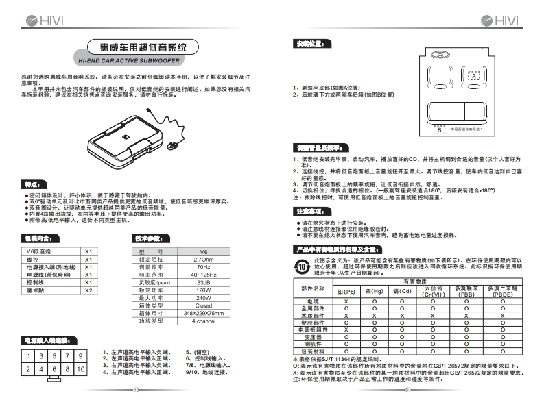 惠威车用超低音系统(V6 MANUAL)V速威美国HiViAcoustc气ne11630 Gddring RoadArcada.CA 91006.USATRet+16269E00606Fa1c+16269300E09惠威中国珠海南感料技有限公同广珠海市联速工业区大林山片区东成路南1号电话07任-868035传商:07566263006,6正8052客户程务线:400-0E09199产品说明书www.hivi.com?因设计变更等原因,所示资料可能与实物不符,惩不另行通知。Due to the reasons inthe change of de sign or others.product information containedhere may not bein con formity with product itselt.Wereserve the right of no prior nodice before change.