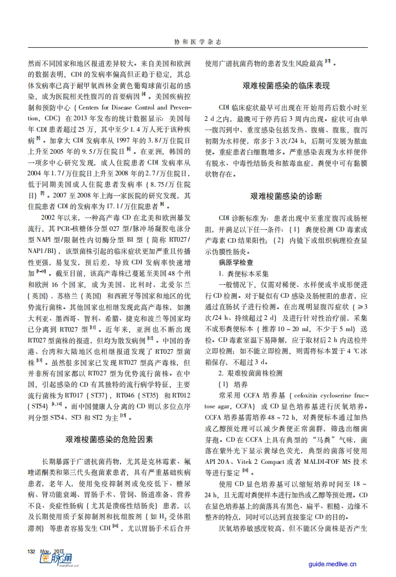 协和医学杂志Medical Journal of Peking Union Medical College Hospital·指南与共识·中国成人艰难梭菌感染诊断和治疗专家共识中国医师协会检验医师分会感染性疾病检验医学专家委员会通信作者:徐英春电话:010691597形6,E-mail:xycpumch@139.cm张曼2电话:01063926389,E-mail:zeng990 aliyun..cam·中国医学科学院北京协和医学院北京协和医院检验科,北京1007302首都医科大学附属北京世纪坛医院临检中心,北京100038【关键词】艰难梭菌;感染;诊断;治疗;共识【中图分类号】R516.1;R446【文献标志码】A【文章编号】16749081(2017)0301318D0L10.3969/i.issn.1674-9081.2017.03.010艰难梭菌(Clostridium difficile,CD)作为医院和终导致死亡。社区感染性腹泻,尤其是伪膜性肠炎等相关疾病的重要病原体,近年来在欧美等发达国家及地区日益受到艰难梭菌毒力因子及致病机制关注。但在中国,医学领域对艰难梭菌感染(C0s一tridium difficile infection,CDI)的认识尚且不足。迄今CD的主要毒力因子为肠毒素A(308kD)和细胞为止,我国尚未有针对CDI诊断和治疗的指南、行业毒素B(270kD),两者均由N-端葡萄糖基转移酶催化标准或专家共识出台。因此,中国医师协会检验医师区(glucosyltransferase domain,GTD)、半胱氨酸蛋白酶分会感染性疾病检验医学专家委员会联合我国行业内活性区(cysteine proteinase domain,CPD)、跨膜区各领域知名专家,共同撰写了本共识,旨在加强临床(transmembrane domain,TMD)和C-端受体结合区医务工作者对CDI的认识,提高对该种疾病的精准诊(receptor binding domain,RBD)组成A。其毒素作用断、治疗与防控能力。的分子机理为:(1)毒素受体结合区(C端重复序列)与细胞受体特异结合;(2)毒素受体形成复合物并引艰难梭菌感染发细胞内吞噬作用:(3)酸性环境使毒素构象发生变化,使毒素的跨膜区插入到细胞膜中并形成孔道:CD是一种革兰阳性厌氧芽孢杆菌,是引起院内(4)毒素在某些细胞因子的共同作用下,发生自我切肠道感染的主要致病菌之一。临床上,约15%~割,产生易位作用,将毒素的GTD释放到胞质内:25%的抗菌药物相关性腹泻(antibiotic associated di-(5)GTD发挥催化作用使tho GTP酶家族糖基化,GTParhea,AAD)、50%~75%的抗菌药物相关性结肠结合蛋白失活,靶细胞肌动蛋白细胞骨架解聚,细胞通炎和95%~100%的伪膜性肠炎(pseudomembranous透性增加,细胞内物质外流,产生炎症,最终导致细胞colitis,PMC)是由CDI引起。CDI主要是由产毒死亡、肠壁坏死、液体积蓄、出现水样腹泻,坏死的肠素CD过度繁殖导致肠道菌群失调并释放毒素所引壁细胞和炎症细胞在肠黏膜上形成伪膜。起,主要临床症状为发热、腹痛、水样便腹泻。CDI通常由长期或不规范使用抗菌药物引起,轻者艰难梭菌感染的流行病学引起腹泻,严重者引发伪膜性肠炎,且常伴有中毒性巨结肠、肠穿孔、感染性休克等并发症,甚至最近年来,CDI已对全球性公共健康造成威胁间基金项日:卫生公益性行业科研专项(20102001);国家自然科学基金青年科学基金项目(81501807刃;北京市优秀人才培养资助青年骨干个人项目(2015000020124G071)al.8Na.2-3131医脉求润Imodlive cnguide.medlive.cn