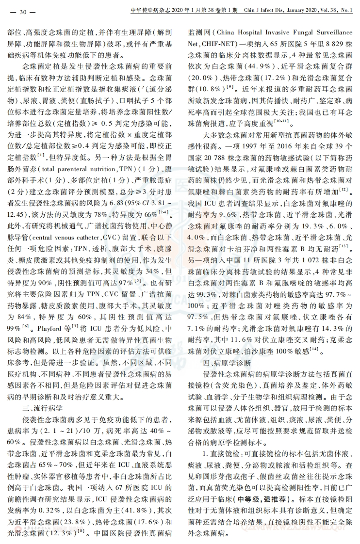 中华传染病杂志2020年1月第38卷第1期Chin J Infect Dis,January2020,Vol.38,No.1-29-·共识与指南·中国成人念珠菌病诊断与治疗专家共识中国成人念珠菌病诊断与治疗专家共识组通信作者:王贵强,北京大学第一医院感染科100034,Email:John131212@hotmail.com,电话:010-83572362【摘要】本共识主要包括念珠菌病的病原学、危险因素、流行病学,病原学诊断,临床诊断和治疗总则,以及各种常见念珠菌病的诊断与治疗细则。皮肤、黏膜念珠菌病,特别是口咽部、食管、阴道等局部感染不属于侵袭性念珠菌病,但临床较为常见,又常为侵袭性念珠菌病的感染源,抑或侵袭性念珠菌病受累器官,故本共识将其纳人。本共识暂不纳入国内尚未常规开展和应用的新技术及药物,对有别于国外指南之处,也给予相关观点表述。由于各种念珠菌病临床表现各异,各医院的菌种及耐药性也各不相同,故临床治疗应结合患者的具体情况进行个体化选择。【关键词】念珠菌病;诊断;治疗D0l:10.3760/cm.j.issn.1000-6680.2020.01.005中图分类号:R519.3,R44,R45念珠菌病(candidiasis)是由各种致病性念珠菌荐:多数人会采纳该方案,但仍有部分人不采纳,要引起的局部或全身感染性疾病。其好发于免疫功能结合患者具体情况做出体现其价值观和意愿的决低下患者,可侵犯局部皮肤、黏膜,以及全身各组织、定。③弱推荐:证据不足,需要患者和医师共同讨器官,临床表现多样、轻重不一。近年来,随着肿瘤论决定。化学治疗、器官移植、糖皮质激素、免疫抑制剂和广一、病原学谱抗菌药物的广泛应用等危险因素增多,侵袭性念念珠菌广泛存在于自然界,为条件致病真菌。珠菌病(invasive candidiasis)发病率呈明显上升趋临床上以白念珠菌(Candida albicans)最为常见,而势。其中念珠菌菌血症是侵袭性念珠菌病最常见的非白念珠菌致病菌种多达16种以上,其中以热带念临床类型,通常预后不佳。早期诊断、及时治疗可明珠菌(Candida tropicalis)、光滑念珠菌(Candida显改善侵袭性念珠菌病患者的预后。因此,近年来glabrata)、近平滑念珠菌(Candida parapsilosis)和克欧美等国相继出台并更新了念珠菌病相关诊断和治柔念珠菌(Candida krusei)较为常见。目前普遍认疗指南,为临床提供有效指导。虽然我国在重症、血识到很多念珠菌存在复合群,如近平滑念珠菌复合液、移植、呼吸等领域也相继出台并更新了侵袭性真群,包含近平滑念珠菌、似平滑念珠菌和拟平滑念珠菌病相关诊治指南,但迄今尚缺乏集各种念珠菌病菌,其他还有光滑念珠菌复合群、季也蒙念珠菌复合诊断和治疗于一体的多学科共识,为此中华医学会群等。复合群中各菌种的生物学特性存在不同程度感染病学分会组织感染、重症、血液、移植、呼吸、皮的差异,对抗真菌药物的体外敏感性也不尽相同。肤、风湿免疫、临床微生物、药学、病理、影像学等相念珠菌在血琼脂和沙氏琼脂上能生长良好,最适宜关学科专家,结合已发表的相关指南、国内外临床研温度为25~37℃。白念珠菌以出芽方式繁殖,产生究数据,经多次讨论、反复修订后形成了本共识。芽生孢子,呈圆形或卵圆形,直径为4~6μm。多数本共识采用GRADE(Grades of Recommendation芽生孢子延伸后,不与母细胞脱离,形成假菌丝,也Assessment,Development,.and Evaluation)评估体可见真菌丝,但光滑念珠菌不形成菌丝。白念珠菌系,将循证证据等级划分如下。①高等级:高质量在沙氏琼脂培养基呈酵母样生长,在米粉吐温琼脂随机对照临床研究、权威指南、系统评价/荟萃分析。培养基中可形成大量假菌丝和具有特征性的顶端厚②中等级:有一定研究局限性的随机对照研究(如壁孢子。念珠菌显色培养基(CHROMagar Candida)无隐蔽分组、未设盲、未报告失访),队列研究、病例有助于临床快速鉴别常见白念珠菌、热带念珠菌、光系列研究,病例对照研究。③低等级:病例报道、专滑念珠闲和克柔念珠闲。家意见、无临床资料的抗菌药物体外药物敏感研究。二、危险因素将专家推荐等级划分如下。①强推荐:绝大多数患侵袭性念珠菌病是一个由病原体定植、感染到者、医师和共识制订者都会采纳该方案。②中等推疾病发生的连续过程,多见于抗菌药物使用导致多