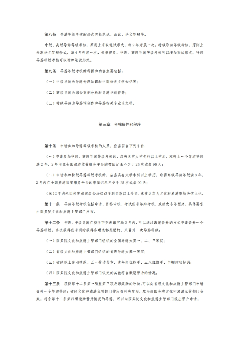 来源:文化和旅游部网站【字体:大中小】打印导游等级考核管理办法(中华人民共和国文化和旅游部令第11号公布《导游等级考核管理办法》已经2024年12月27日文化和旅游部部务会议审议通过,自2025年3月1日起施行。)第一章总则第一条为加强导游队伍建设,提高导游综合素质和职业技能,促进导游服务水平提升,根据《中华人民共和国旅游法》《导游人员管理条例》等法律、行政法规,制定本办法。第二条导游等级的考核和管理适用本办法。第三条全国实行统一的导游等级考核制度。导游等级分为初级、中级、高级、特级四个等级。第四条申请参加导游等级考核的人员,应当践行社会主义核心价值观,具备良好的职业道德和职业操守,掌握从事导游职业所需的知识和能力。第五条导游等级考核工作遵循自愿申报、逐级晋升、科学规范和动态管理的原则。第六条国务院文化和旅游主管部门负责组织实施全国导游等级考核工作。省级文化和旅游主管部门按照国务院文化和旅游主管部门统一要求,负责实施本行政区域内的导游等级考核具体工作。第二章考核方式和内容第七条取得导游资格证书的人员,在依法申请取得导游证后,即获得初级导游等级。中级、高级导游等级通过考核或者激励晋升的方式获得。特级导游等级通过考核的方式获得。