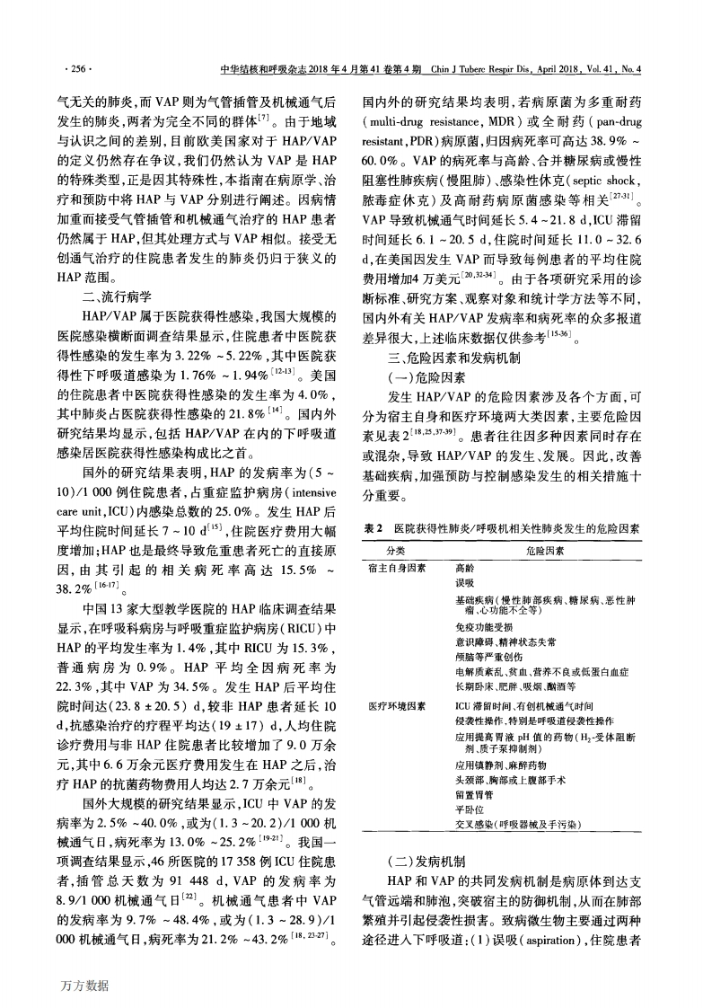 中华结核和呼吸杂志2018年4月第41卷第4期Chin】Tuberc Respir Dis,April2018,Vol.41,No,4·255..诊疗方案·中国成人医院获得性肺炎与呼吸机相关性肺炎诊断和治疗指南(2018年版)中华医学会呼吸病学分会感柒学组医院获得性肺炎(hospital-acquired pneumonia,表1证据等级和推荐等级HAP)与呼吸机相关性肺炎(ventilator-associated证据等级与推荐等级说明pneumonia,VAP)是我国最常见的医院获得性感染,证据等级诊断和治疗较为困难,病死率高。我国于1999年发等级I(高等级)高质量的随机对照临床研究(RCT)、权威指南以及高质量的系统综述和荟萃分析表了“医院获得性肺炎诊断和治疗指南(草案)”,等毁Ⅱ(中等级)有一定研究局限性的RCT研究(如无隐戴迄今已近20年,在此期间国内外发表了许多HAP/分组、未设盲、未报告失访)、队列研究、病例系列研究及病例对照研究VAP相关指南并历经更新2o)。随着相关研究的日等级Ⅲ(低等级)病例报道,专家意见及无临床资料的抗菌药益深入,HAP/VAP的定义在发生变化,流行病学、病物体外药敏试验结果原学、临床诊断和治疗等方面也积累了大量新的研推荐等级A(强推荐)该方案绝大多数患者,医师和政策制定者均究成果,特别是我国自己的研究证据日渐增多,结果会采纳显示我国HAP/VAP在病原学分布和耐药率方面与B(中度推荐)该方案多数人会采纳,但仍有部分人不采国外有较大差异。因此,需要对原有的指南进行修纳,要结合惠者具体情况作出体现其价值戏和意愿的决足订,以更好地指导临床实践。C(弱推荐)证据不足,需要患者、医师和政策制定者共本指南由中华医学会呼吸病学分会感染学组组同封论决定织修订。经过多次现场工作会议,确定了HAP/VAP的整体框架和主要更新内容:在遵循循证医学证据一、定义的基础上,经全体学组委员反复讨论,形成统一意HAP是指患者住院期间没有接受有创机械通见,并广泛征求国内外相关领域专家的意见后,经过气、未处于病原感染的潜伏期,而于入院48h后新多次修改,最终定稿。证据等级和推荐等级参照发生的肺炎。VAP是指气管插管或气管切开患者“中国成人社区获得性肺炎(community-acquired接受机械通气48h后发生的肺炎,机械通气撤机、pneumonia,CAP)诊断和治疗指南(2016年版)”[川。拔管后48h内出现的肺炎也属于VAP范畴23)。证据等级是对研究证据质量的评价,推荐等级是对HAP的早期定义为任何发生在医院内的、由医一项干预措施利大于弊的确定程度的评价(表1)。院环境中存在的病原菌引起的肺实质感染。1999般来讲,证据等级越高,推荐等级也越高,但有时年我国“医院获得性肺炎诊断和治疗指南(草案)"四中HAP的定义包括了建立人工气道和机械证据等级和推荐等级并不完全对应,还需要权衡证通气后发生的肺炎。以往国内外众多关于HAP的据的来源、患者的意愿、价值观和资源消耗等做出判临床研究混杂因素较多,包括了一部分机械通气的断。我们强调,在同等循证医学证据等级的前提下,患者,但均认为VAP是HAP的特殊类型。由于优先采纳我国的证据和研究成果。HAP和VAP在临床特征、经验性治疗和预防策略上本指南的适用范围为年龄≥18周岁的非免疫存在较大的差异,2005年版美国感染性疾病协会缺陷的HAP/VAP患者,主体分为8个部分及1个(IDSA)/美国胸科协会(ATS)制定的HAP/VAP指附件。期望通过本次修订和推广,进一步规范我国南中将原有的广义HAP区分为狭义的HAP与VAPHAP/VAP的诊断和治疗。两大类型2。近年来的证据进一步证实HAP和D0I:10.3760/cmm.j.issn.1001-0939.2018.04.006VAP在经验性治疗和临床预后方面均有明显不同,通信作者:瞿介明200025,上海交通大学附属瑞金医院呼吸与2016年版美国HAP/VAP指南更新时特别强调危重症医学科.Email:jmqu0906@163.comHAP仅指住院后发生的没有气管插管的、与机械通万方数据