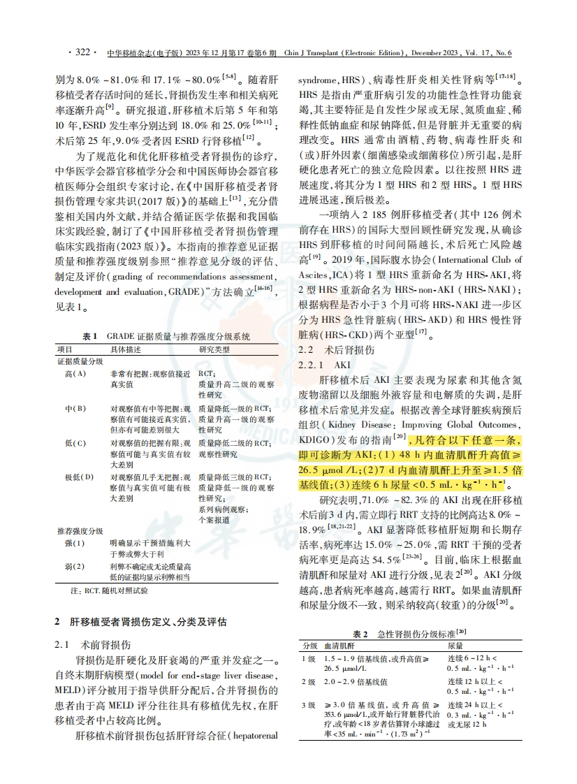 中华移植杂志(电子版)2023年12月第17卷第6期Chin J Transplant(Electronie Edition),December2023.Val.17.No.6·321··标准与指南·中国肝移植受者肾损伤管理临床实践指南(2023版)中华医学会器官移植学分会中国医师协会器官移植医师分会【摘要】肾损伤是肝移植术后常见并发症,主要包括急性肾损伤和慢性肾脏病。肝移植受者肾损伤严重影响受者长期生存和生活质量,是导致受者术后死亡的主要原因之一。为了规范化和优化肝移植受者肾损伤的诊疗,中华医学会器官移植学分会和中国医师协会器官移植医师分会组织专家在《中国肝移植受者肾损伤管理专家共识(2017版)》的基础上,结合近年来循证医学依据和我国临床实践经验,制订了《中国肝移植受者肾损伤管理临床实践指南(223版)》,以适应诊疗模式快速发展的新形势。本指南重点阐述肝移植受者肾损伤定义,分类、评估以及术前、术中和术后防治等内容,并科学规范地提出了系列推荐意见,旨在优化我国肝移植受者肾损伤管理。【关键词】肝移植;急性肾损伤;慢性肾脏病:肾损伤管理Clinical practice guidelines for kidney injury management of liver transplant recipients in China(2023 edition)Branch of Organ Transplant of Chinese Medical Association,Branch of OrganTransplant Physicians of Chinese Medical Doctor AssociationCorresponding author:Xu Xiao,Zhejiang University School of Medicine,Hangzhou 310003,Email:zpu@zju.edu.cn;Zheng Shusen,Zhejiang University School of Medicine,Hangzhou 310003,Email:zyzss@zju.edu.cn[Abstract]Kidney injury is a common complication after liver transplantation,including acutekidney injury and chronic kidney disease.Kidney injury in liver transplant recipients seriously affectstheir long-term survival and life quality,and is one of the main causes of death after livertransplantation.In order to standardize and optimize the diagnosis and treatment of kidney injury in livertransplant recipients,Branch of Organ Transplant of Chinese Medical Association and Branch of OrganTransplant Physicians of Chinese Medical Doctor Association organize experts to develop the "ClinicalPractice Guidelines for Kidney Injury Management of Liver Transplant Recipients in China (2023Edition)"to adapt to the rapid development of diagnosis and treatment.The guideline is based on"Chinese expert consensus on management of kidney injury in liver transplant recipients (2017edition)"and in conjunction with recent evidence-based medicine and clinical practice experience inChina.This guideline focuses on the definition,classification,assessment and preoperative,intraoperative and postoperative prevention and treatment of kidney injury in liver transplant recipients.By presenting a series of scientifically standardized recommendations,the guideline is aimed to optimizethe management of kidney injury in liver transplant recipients in China.[Key words]Liver transplantation;Acute kidney injury;Chronic kidney disease;Kidneyinjury management加,更可能引起感染、高血压病、营养不良、贫血、电1前言解质紊乱和骨质疏松等。严重的肾损伤可发展肾损伤作为肝移植术后常见并发症,不仅会导为终末期肾病(end-stage renal disease,ESRD),需行致受者住院频率增加、住院时间延长和治疗费用增肾脏替代治疗(renal replacement therapy,RRT)或肾移植,对肝移植受者长期生存和生活质量产生极大D0:10.3877/c4.j.isn.1674-3903.2023.06.001影响,是导致受者术后死亡的主要原因之一1,4。基金项目:国家自然科学基金重点项目(81930016):国家重点肾损伤包括急性肾损伤(acute kidney injur町y,研发计划重点专项(2021YFA1100500)AKI)和慢性肾脏病(chronic kidney disease,CKD)。通信作者:徐骁,浙江大学医学院,310003杭州,Email:u@ju.edu.cn:郑树森,310003杭州,浙江大学医学院,Email:ys@由于定义标准和随访时间的不同,文献报道肝移植术zju.edu.cn后肾损伤发生率差异较大,AKI和CKD的发生率分