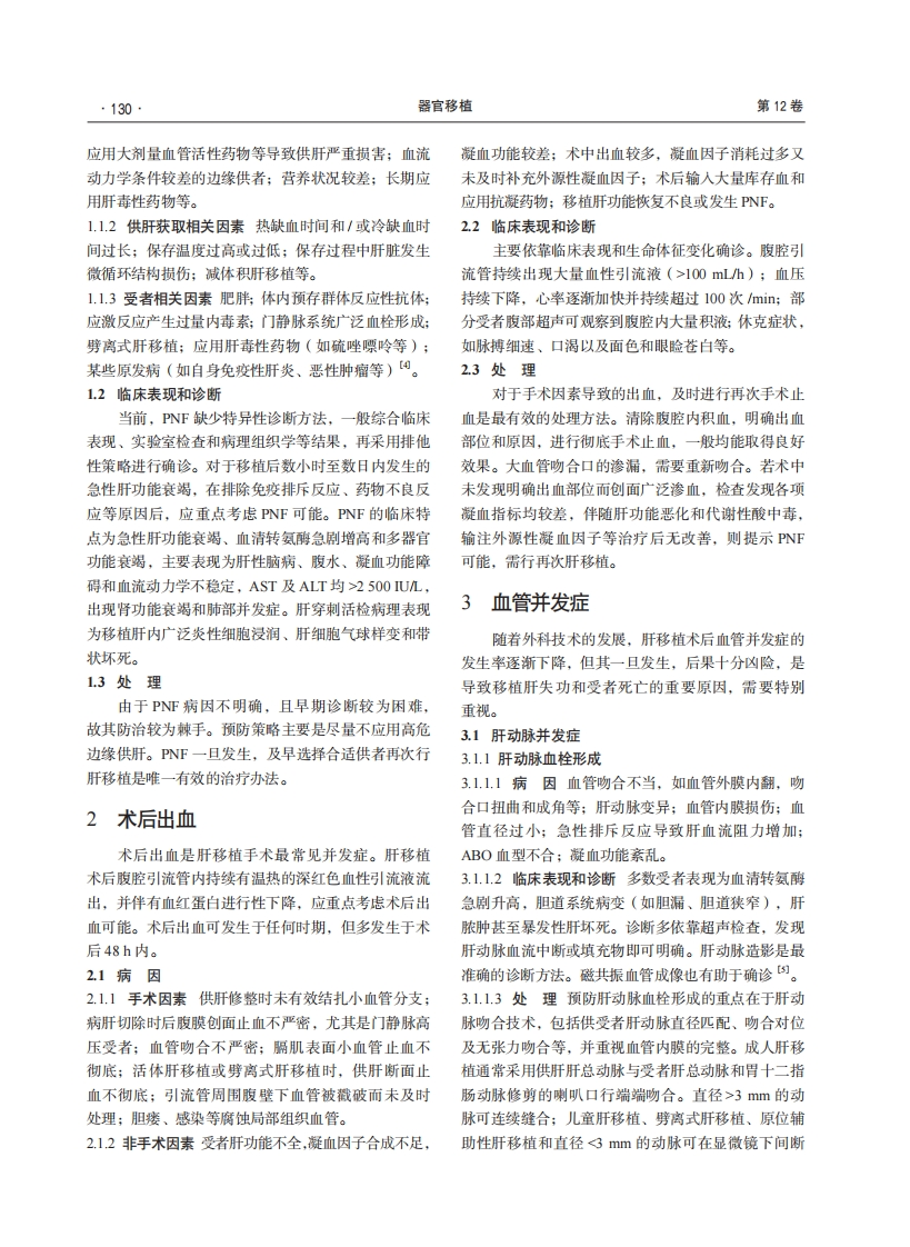 第12卷,第2期器官移植Vol.12 No.22021年3月Organ TransplantationMar.2021·诊疗规范·中国肝移植术后并发症诊疗规范(2019版)中华医学会器官移植学分会【摘要】肝移植手术技术日臻成熟,效果确定,但术后仍可能发生移植肝无功能、术后出血及胆道并发症等,影响受者长期存活。为进一步规范肝移植术后并发症诊疗,中华医学会器官移植学分会组织肝移植专家,总结国内外相关研究最新进展,并结合国际指南和临床实践,针对肝移植术后并发症的诊断与治疗,制订《中国肝移植术后并发症诊疗规范(2019版)》。【关键词】肝移植;并发症;诊断;治疗【中图分类号】R617,R619【文献标志码】A【文章编号】1674-7445(2021)02-0002-05Diagnosis and treatment specification for postoperative complications after liver transplantation in China (2019 edition)Branch ofOrgan Transplamntation of Chinese Medical Association.Xijing Hospital ofAir Force Medical University.Xi'an 710032.ChinaCorresponding author:Tao Kaishan,Email:taokaishan0686@163.com[Abstraet]The surgical techniques of liver transplantation are increasingly sophisticated with the definiteeffect.However,postoperative complications,such as liver graft nonfunction,postoperative bleeding and biliary tractcomplication may still occur,which may affect the long-term survival of the recipients.To further standardize thediagnosis and treatment of postoperative complications after liver transplantation,Branch of Organ Transplantation ofChinese Medical Association organized liver transplant experts to summarize the latest research progress at home andabroad,integrate international guidelines and clinical practice and formulate the "Diagnosis and treatment specification forpostoperative complications after liver transplantation in China (2019 Edition)"based upon the diagnosis and treatment ofpostoperative complications after liver transplantation.[Key words]Liver transplantation;Complication;Diagnosis;Treatment随着肝移植技术的不断完善,受者5年生存率相比,肝移植术后PF的发生率并不高,文献报道已达70%~85%,但术后各类并发症的发生率约为约为0.6%-10.0%),然而一旦发生只能行二次肝移植,14%~35%,仍是影响受者生存质量、受者和移植肝否则病死率高达100%。长期存活的重要危险因素口。1.1病因1原发性移植物无功能(primaryPNF是多种病理过程共同作用的结果,其病因和发生机制尚未完全明确,可能与以下3方面因素nonfunction,PNF)有关。PNF是肝移植术后早期最为严重的并发症之一1.1.1供者相关因素年龄>50岁;严重脂肪肝(供肝往往危及受者生命,导致移植失败冈。与其他并发症脂肪变性>60%);术前供者低血压、低氧血症以及D0L:10.3969j.is5sn.16747445.2021.02.002作者单位:710032西安,空军军医大学西京医院通信作者:陶开山,Email:taokaishan0686@163.com