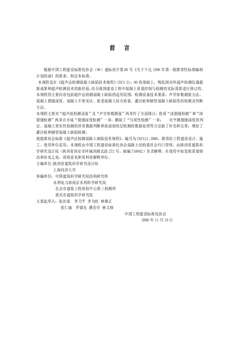 中国工程建设标准化协会标准超声法检测混凝土缺陷技术规程348072@abc4个月前发布关注私信2.71MB28页045中国工程建设标准化协会标准超声法检测混凝土缺陷技术规程此内容为付费资源,请付费后查看¥10¥12黄金会员免费钻石会员免费立即购买您当前未登录!建议登陆后购买,可保存购买订单付费资源 第1页 / 共28页 第2页 / 共28页 试读已结束,还剩26页,您可下载完整版后进行离线阅读 THE END标准规范 文本预览 附件一中国工程建设标准化协会标准超声法检测混凝土缺陷技术规程Technical specification for inspection ofConcrete defects by ultrasonic methodCECS21:2000主编单位:陕西省建筑科学研究设计院上海同济大学批准单位:中国工程建设标准化协会批准日期:2001年1月1日2000·北京 查看更多 收起部分 喜欢就支持一下吧收藏