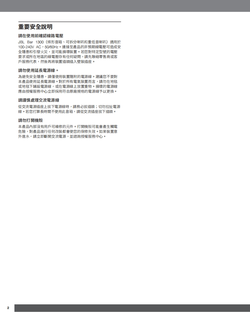 JBLBAR1300-操作使用说明书手册348072@abc6个月前发布关注私信5.50MB30页034JBLBAR1300-操作使用说明书手册此内容为付费资源,请付费后查看¥20¥23黄金会员免费钻石会员免费立即购买您当前未登录!建议登陆后购买,可保存购买订单付费资源 第1页 / 共30页 第2页 / 共30页 试读已结束,还剩28页,您可下载完整版后进行离线阅读 THE END说明书手册 文本预览 JBLHARMANBAR 1300用戶手冊 查看更多 收起部分 喜欢就支持一下吧收藏