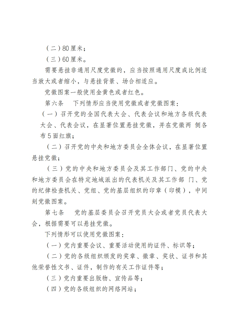 中国共产党党徽党旗条例(2021年6月17日中共中央政治局常委会会议审议批准2021年6月26日中共中央发布)第一条为了规范党徽党旗制作、使用、管理,充分发挥党徽党旗的政治功能,增强党的凝聚力、战斗力,激发党员党的意识,激励全党不忘初心、牢记使命,坚定理想信念,团结带领全国各族人民在党的旗帜下奋勇前进,根据《中国共产党章程》,制定本条例。第二条中国共产党党徽为镰刀和锤头组成的图案。中国共产党党旗为旗面缀有金黄色党徽图案的红旗。党徽党旗表明中国共产党是中国工人阶级的先锋队,同时是中国人民和中华民族的先锋队,是为中国人民谋幸福、为中华民族谋复兴,为坚持和发展中国特色社会主义、为实现共产主义远大理想而不懈奋斗的马克思主义政党。第三条中国共产党的党徽党旗是中国共产党的象征和标志。党的各级组织和每一个党员都要维护党徽党旗的尊严。第四条党徽党旗制作、使用、管理必须坚持统一标准、统一规范,坚持分级负责、集中管理。第五条党徽直径的通用尺度为下列3种:(一)100厘米;