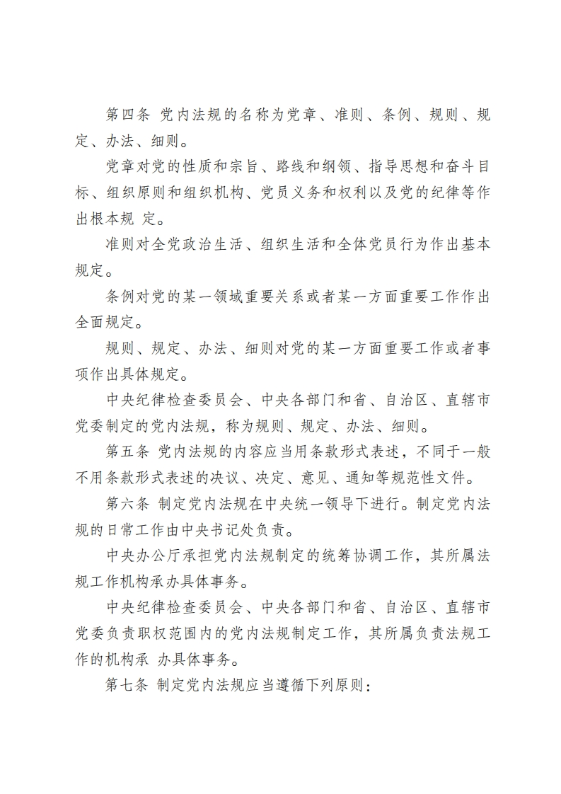 中国共产党党内法规制定条例第一章总则第一条为了规范中国共产党党内法规制定工作,建立健全党内法规制度体系,提高党的建设科学化水平,根据《中国共产党章程》,制定本条例。第二条党内法规是党的中央组织以及中央纪律检查委员会、中央各部门和省、自治区、直辖市党委制定的规范党组织的工作、活动和党员行为的党内规章制度的总称。党章是最根本的党内法规,是制定其他党内法规的基础和依据。第三条党的中央组织制定的党内法规称为中央党内法规。下列事项应当由中央党内法规规定:(一)党的性质和宗旨、路线和纲领、指导思想和奋斗目标;(二)党的各级组织的产生、组成和职权;(三)党员义务和权利方面的基本制度;(四)党的各方面工作的基本制度;(五)涉及党的重大问题的事项;(六)其他应当由中央党内法规规定的事项。中央纪律检查委员会、中央各部门和省、自治区、直辖市党委就其职权范围内有关事项制定党内法规。