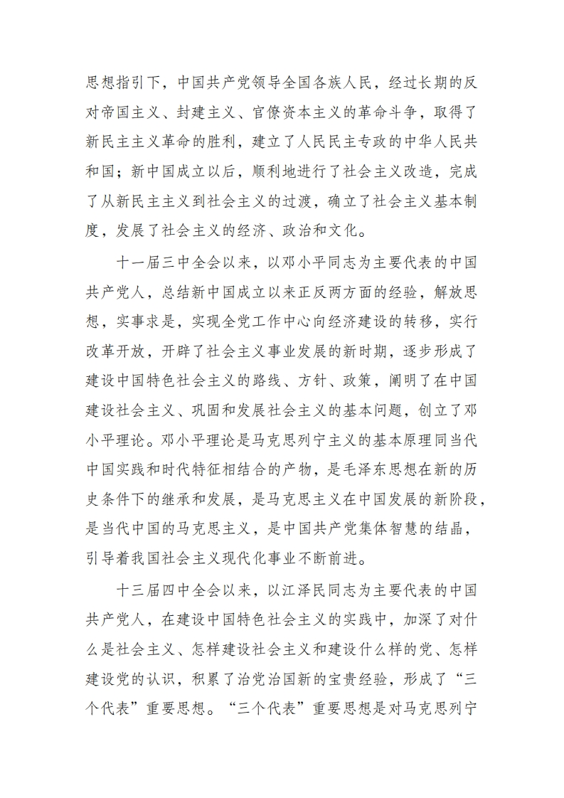 总纲中国共产党是中国工人阶级的先锋队,同时是中国人民和中华民族的先锋队,是中国特色社会主义事业的领导核心,代表中国先进生产力的发展要求,代表中国先进文化的前进方向,代表中国最广大人民的根本利益。党的最高理想和最终目标是实现共产主义。中国共产党以马克思列宁主义、毛泽东思想、邓小平理论、“三个代表”重要思想、科学发展观、习近平新时代中国特色社会主义思想作为自己的行动指南。马克思列宁主义揭示了人类社会历史发展的规律,它的基本原理是正确的,具有强大的生命力。中国共产党人追求的共产主义最高理想,只有在社会主义社会充分发展和高度发达的基础上才能实现。社会主义制度的发展和完善是一个长期的历史过程。坚持马克思列宁主义的基本原理,走中国人民自愿选择的适合中国国情的道路,中国的社会主义事业必将取得最终的胜利。以毛泽东同志为主要代表的中国共产党人,把马克思列宁主义的基本原理同中国革命的具体实践结合起来,创立了毛泽东思想。毛泽东思想是马克思列宁主义在中国的运用和发展,是被实践证明了的关于中国革命和建设的正确的理论原则和经验总结,是中国共产党集体智慧的结晶。在毛泽东