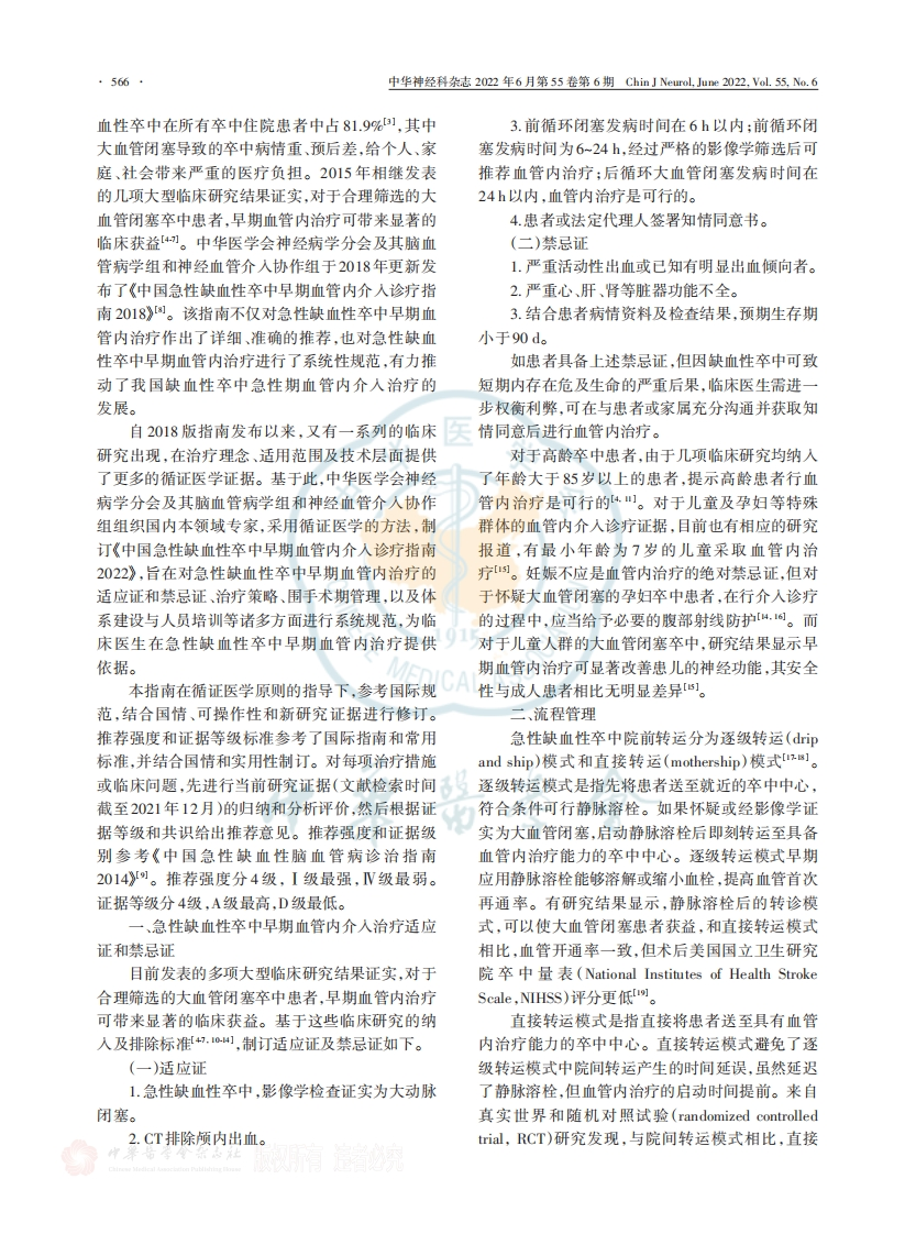 中华神经科杂志2022年6月第55卷第6期Chin J Neurol,June2022.Val.55,No.6·565·指南·中国急性缺血性卒中早期血管内介入诊疗指南2022中华医学会神经病学分会中华医学会神经病学分会脑血管病学组中华医学会神经病学分会神经血管介入协作组通信作者:刘新峰,东部战区总医院神经内科,南京210002,Email::xfliu22@vip.163.com彭斌,中国医学科学院北京协和医院神经科,北京100730,Email:pengbin.3@hotmail.c0m;王拥军,首都医科大学附属北京天坛医院神经内科国家神经系统疾病临床医学研究中心,北京100070,Email:yongjunwangl9962@gmail.com【摘要】中华医学会神经病学分会及其脑血管病学组和神经血管介入协作组组织相关专家在《中国急性缺血性卒中早期血管内介入诊疗指南2018》的基础上,结合近3年来相关的循证医学证据和我国的临床实际,制订了《中国急性缺血性卒中早期血管内介入诊疗指南2022》。这一指南对急性缺血性卒中早期血管内介入治疗的适应证和禁忌证、流程管理、术前评估、血管内治疗策略、围手术期管理、体系建设和人员培训进行了广泛更新,旨在为临床实践给予规范性指导。【关键词】脑缺血;卒中;机械取栓;溶栓治疗;指南Chinese guidelines for the endovascular treatment of acute ischemic stroke 2022Chinese Society of Neurology,Chinese Stroke Society,Neurovascular Intervention Group of ChineseSociety of NeurologyCorresponding authors:Liu Xinfeng.Department of Neurology,General Hospital of Eastern TheaterCommand,Nanjing 210002,China,Email:xfliu2@vip.163.com;Peng Bin,Department of Neurology,PekingUnion Medical College Hospital,Chinese Academy of Medical Sciences,Beijing 100730,China,Email:pengbin3@hotmail.com:Wang Yongjun,Department of Neurology,Beijing Tiantan Hospital,CapitalMedical University,National Clinical Research Center for Neurological Diseases,Beijing 100070,China,Email:yongjunwang1962@gmail.comAbstract Chinese guidelines for the endovascular treatment of acute ischemic stroke2022 are based on the current available evidence and the realities of clinical practice in China.Theseguidelines supersede the 2018 guidelines.The writing members of the guidelines were appointed bythe Chinese Stroke Society and Neurovascular Intervention Group of Chinese Society of Neurology.This guideline provides an up-to-date comprehensive set of recommendations on the indications andcontraindications of early endovascular treatment,process management,preoperative evaluation,endovascular treatment strategy,perioperative management,system construction and personneltraining.The purpose of the guideline is to achieve standardized guidance for the endovasculartreatment for ischemic stroke.【Key words】Brain ischemia;Stroke;Mechanical thrombectomy;Thrombolytictherapy;GuidelineConflicts of interest:None declared脑血管病是我国居民的第一位死亡原因,并且中国人群的终生卒中患病风险居世界首位。缺D01:10.3760/cma.j.cm113694-20220225-00137收稿日期2022-02-25本文编辑许倩引用本文:中华医学会神经病学分会,中华医学会神经病学分会脑血管病学组,中华医学会神经病学分会神经血管介入协作组.中国急性缺血性卒中早期血管内介入诊疗指南2022[.中华神经科杂志,202255(6)565-580.D01:10.3760/cma-j.cnl13694-20220225-00137.