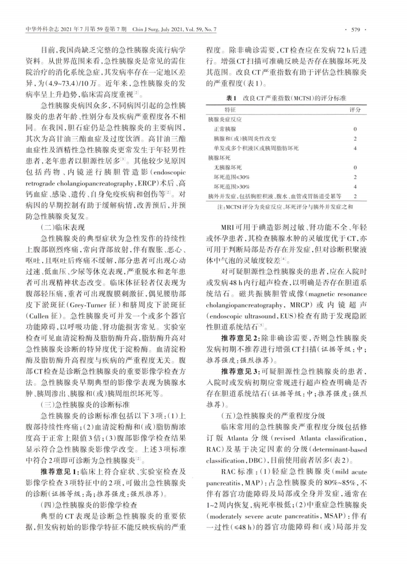 ·578·中华外科杂志2021年7月第59卷第7期Chin J Surg.July2021.Val.59.Na.7指南与规范·中国急性胰腺炎诊治指南(2021)中华医学会外科学分会胰腺外科学组通信作者:赵玉沛,中国医学科学院北京协和医学院北京协和医院基本外科100730,Email:zhao8028@263.net【摘要】急性胰腺炎是一种消化系统常见的急腹症。近年来,急性胰腺炎在诊治理念,方式,策路等方面取得了长足进步,对推动急性胰腺炎诊疗规范化,提高患者救治水平发挥了重要作用。本指南在以往指南和专家共识的基础上,采用以循证为依据,间题为导向的表述方式.综合近5年国内外重要临床研究数据,经多学科专家讨论,形成29条推荐意见,包含诊断、治疗及随访三部分,希望木指南为中国急性胰腺炎临床诊疗实践提供证据支持。【关键词】急性胰腺炎:诊断:治疗:随访:指南Guidelines for diagnosis and treatment of acute pancreatitis in China(2021)Chinese Pancreatic Surgery Association,Chinese Society of Surgery,Chinese Medical AssociationCorresponding author:Zhao Yupei,Department of General Surgery,Peking Union Medical CollegeHospital,Chinese Academy of Medical Sciences Peking Union Medical College,Beijing 100730,China,Email:zhao8028@263.netAbstract Acute pancreatitis is a common acute abdomen of the digestive system.Inrecent years,great progress has been made in the diagnosis and treatment concepts,methods andstrategies of acute pancreatitis,which plays an important role in promoting the standardization ofacute pancreatitis management and improving the level of patient treatment.Based on the previousguidelines and expert consensus,this guideline adopts an evidence-based and problem-orientedpresentation in a way.Comprehensive analysis of the data of important domestic and foreign clinicalresearch in the past 5 years,29 recommendations are formed after multi-disciplinary expertdiscussion which including diagnosis,treatments and follow-up,with the expectation of providingevidence support for clinical practice of acute pancreatitis in China.Key words Acute pancreatitis;Diagnosis;Treatment;Follow-up;Guideline急性胰腺炎指因胰酶异常激活对胰腺自身及实践提供证据,并促进其与国际接轨周围器官产生消化作用而引起的、以胰腺局部炎症本指南在参考以往指南及专家共识的基础上,反应为主要特征,甚至可导致器官功能障碍的急腹采用以循证为依据、问题为导向的表述方式,经专症。2014年,经中华医学会外科学分会胰腺外科家充分讨论,形成29条推荐意见,包含诊断、治疗学组反复讨论、修改后,发布了《急性胰腺炎诊治指及随访三部分。本指南使用建议、评估、发展和评南(2014)》"。该指南的发布对推动急性胰腺炎诊价的分级系统评估临床证据质量(高、中、低),并采疗规范化,提高患者救治水平发挥了重要作用。用推荐强度(强烈推荐和一般性推荐)表示制定专7年来,急性胰腺炎在诊治理念、方式、策略等方面家对推荐意见的认可程度发生了显著变化,为体现学科进展,学组对2014版一、急性胰腺炎的诊断指南进行了修订,以期为中国急性胰腺炎临床诊疗(一)流行病学与病因学D01:10.3760/ema.j.cn112139-20210416-00172收稿日期2021-04-16本文编辑李静引用本文:中华医学会外科学分会胰腺外科学组.中国急性胰腺炎诊治指南(2021小中华外科杂志.2021.597:578-587.D0l:10.3760/ema.j.cn112139-20210416-00172.