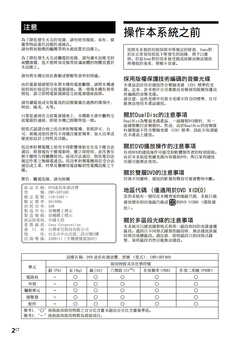 SONY索尼CMT-SBT40D操作说明书手册348072@abc6个月前发布关注私信2.16MB36页026SONY索尼CMT-SBT40D操作说明书手册此内容为付费资源,请付费后查看¥20¥23黄金会员免费钻石会员免费立即购买您当前未登录!建议登陆后购买,可保存购买订单付费资源 第1页 / 共36页 第2页 / 共36页 试读已结束,还剩34页,您可下载完整版后进行离线阅读 THE END说明书手册 文本预览 SONYHome Audio System使用前的準備工作播放光碟使用說明書收聽廣播聆聽USB装置中的檔案使用選購的音頻組件聆聽音樂透過BLUETOOTH:連接來聆聽音樂其他資訊故障檢查使用前須知/規格CMT-SBT40D 查看更多 收起部分 喜欢就支持一下吧收藏