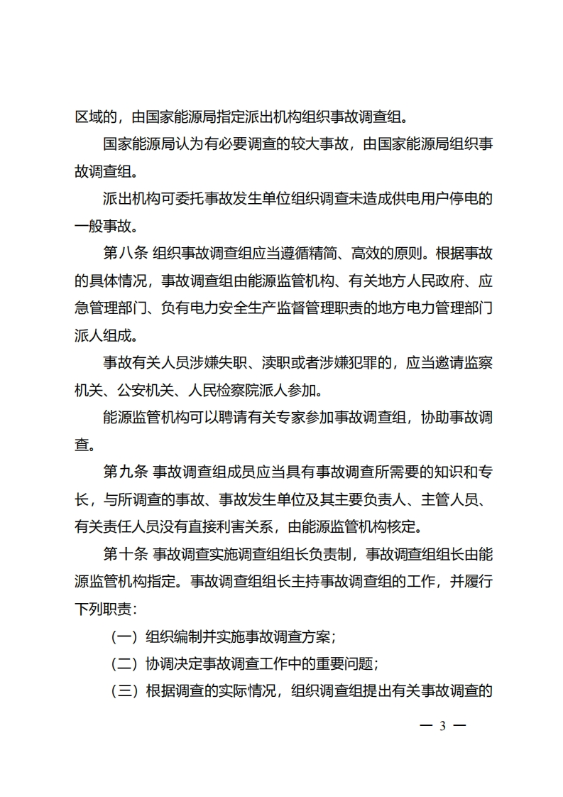 电力安全事故调查程序规定第一条为了规范电力安全事故调查工作,根据《中华人民共和国安全生产法》《生产安全事故报告和调查处理条例》和《电力安全事故应急处置和调查处理条例》等法律法规,制定本规定。第二条国家能源局及其派出机构(以下简称能源监管机构)组织调查电力安全事故(以下简称事故),适用本规定。国务院授权国家能源局组织调查特别重大事故,国家另有规定的,从其规定。第三条事故调查应当按照依法依规、实事求是、科学严谨、注重实效的原则,及时、准确地查清事故原因,查明事故性质和责任,评估应急处置工作,总结事故教训,提出整改措施,并对事故责任单位和人员提出处理建议。第四条任何单位和个人不得阻挠和干涉对事故的依法调查。第五条能源监管机构调查事故,应当及时组织事故调查组。第六条重大事故、国务院授权组织调查的特别重大事故由国家能源局组织事故调查组。第七条较大事故、一般事故由事故发生地国家能源局派出机构(以下简称派出机构)组织事故调查组。较大事故、一般事故跨省(自治区、直辖市)的,由事故发生地国家能源局区域监管局组织事故调查组;较大事故、一般事故跨2