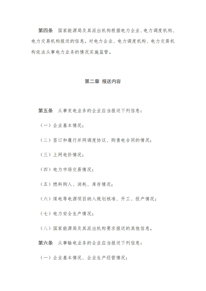来源:发展改革委网站【字体:大中小】打印电力企业信息报送规定(2024年2月5日经国家发展改革委第9次委务会通过2024年2月8日国家发展改革委令第13号公布自2024年4月1日起施行)】第一章总则第一条为了加强电力监管,规范电力企业、电力调度机构、电力交易机构信息报送行为,维护电力市场秩序,根据《电力监管条例》,制定本规定。第二条电力企业、电力调度机构、电力交易机构向国家发展改革委、国家能源局及其派出机构、省级政府主管部门报送与监管事项相关的文件、资料,适用本规定。第三条电力企业、电力调度机构、电力交易机构报送信息遵循真实、及时、完整的原则。