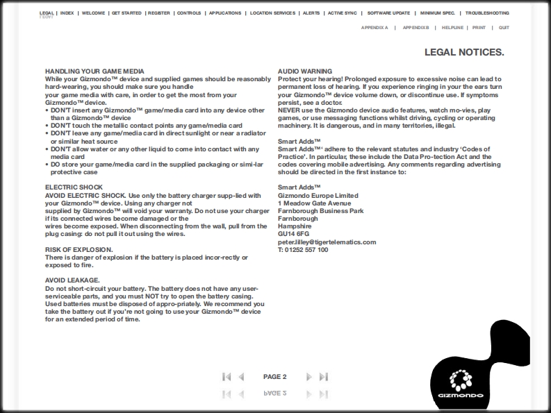 APPENDIX A APPENDIXB HELPLINE PRINT QUTLEGAL NOTICES.TM and 'Gizmondo',the 'Gizmondo'device and'Smart AddsTM;arerisk even if you have never suffered symptoms before.If you or a closeTrademarks of Gizmondo Europe Limited.relative have a di-agnosed epileptic condition,consult your doctor before2005 Gizmondo Europe limited.All rights reserved.FOR NONplay-ing video games or watching movies.Similarly,if you experienceCOMMERCIAL PERSONAL USE ONLY.any symptoms of epilepsy while playing,you should stop IMMEDIATELYand visit a doctor as soon as possible.Symptoms include any ofThe Bluetooth TM word mark and logos are owned by the Bluetooth TM SIG,the following:dizziness,altered vision,twitching in the eyes or face,Inc.and amy use of such marks by Gizmondo Europe Limited is underother involuntary movement,loss of awareness of your surroundings,license.2005 Microsoft Corporation.All rights reserved.Microsoft,disorientation and convulsions.Windows,Windows Powered and the Windows Logo are eitherregistered trademarks or trademarks of Microsoft Corporation in theNOTICE TO PARENTSUnited States and/or other countries.Please go over this information with your children before they begin toThe name NVIDIATM and the NVIDIATM logo are registered trade-marksuse their Gizmondo TM devices.Make sure they are properly supervisedof NVIDIATM corporation.The name GoForce and the GoForce productwhen they are using their Gizmondo TM devices.Ensure they notify youlogos are trademarks of NVIDIATM corpora-tion.if they feel symptoms described in the Health Waming notice of thisOther trademarks and tradenames are those of their respective owners.document and take necessary action as outlined above.The Gizmondo TM device is not designed and is not suitable for thoseHEALTH WARNINGunder 15.Take a break of around 10-15 minutes for every hour you play,even ifyou feel that you don'tneed it.Playing video games also carries thePIRACY NOTICErisk of such conditions as Carpal Tunnel Syndrome,tendonitis andWe take piracy seriously:It damages legitimate developers,publishersskin imitation.If your hands,wrists or arms become tired or sore whileand retailers alike.Furthermore,amy unauthorized reproduction of allplaying,stop and rest for a few hours.If symptoms continue during oror any game part of the GizmondoTM device or unaut-horised use ofafter play,stop and consult a doctor as soon as possible.registered trademarks is likely to constitute a criminal offence.If youTo avoid eyestrain,use your GizmondoTM device in reasonably lit areas,suspect any game product is an unauthorised copy,or you have anyand hold your console at a reasonable distance from your eyes.We alsoinformation about pirated Gizmondo TM device products,please get inadvise against playing when overly tired or suffering from a lack of sleep.touch with our helpline.Relevant contact details are located at the backPlease note that playing video games or watching movies can lead toof this manual.motion sickness,so if you experience any na