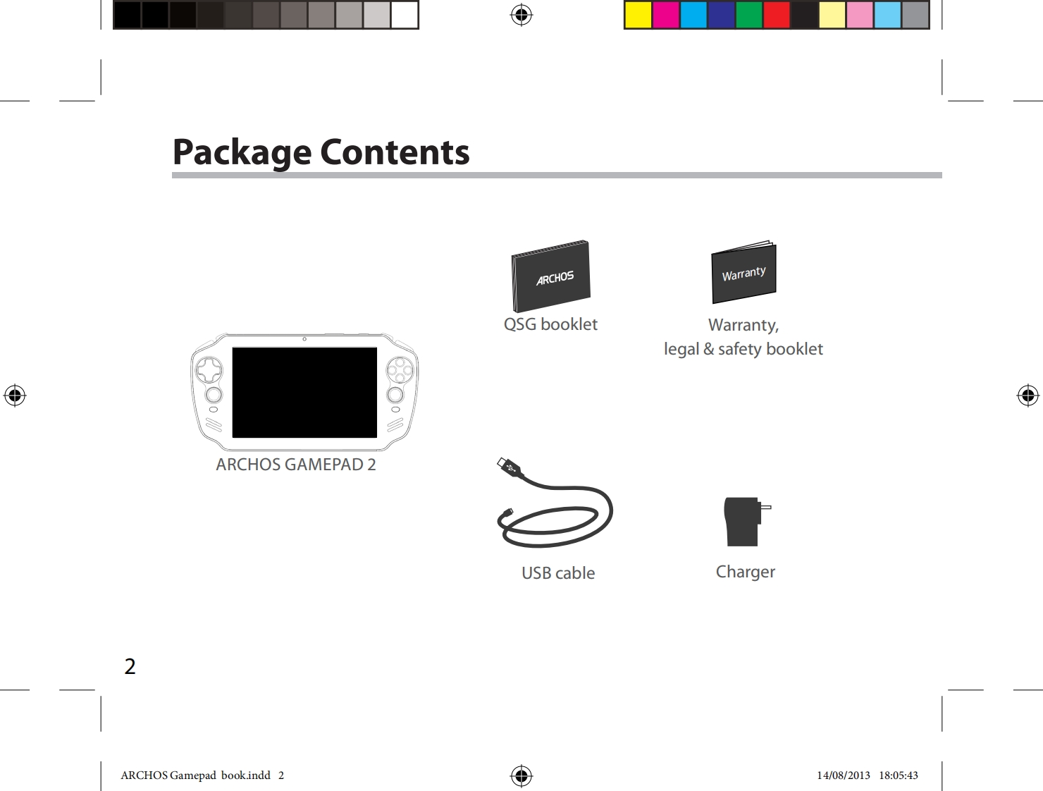 ⊕ENTable of contentsPackage Contents.......Getting started…Description of the device...........Connecting to a WiFi network.....6ARCHOS mapping tool.......⊕The AndroidTM interface........14⊕Getting familiar with AndroidTM18Troubleshooting..20For more information,please consult the FAQs of your product on www.archos.com.Make sure to read them before considering any product return.1ARCHOS Gamepad book.indd 1@14/08/201318:05:42