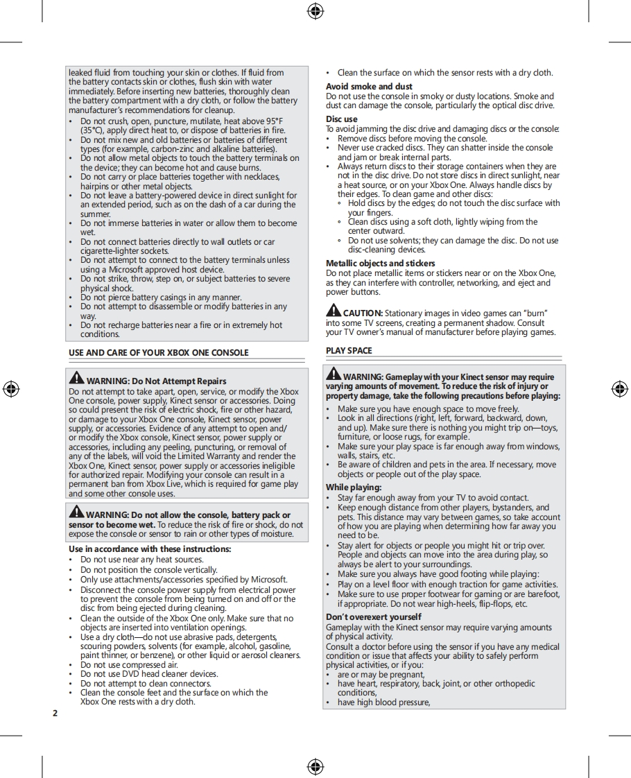 @XBOXONEX18-91717-02XBOX ONE AND KINECT SENSORcorrect power supply unit,compare the model number onPRODUCT GUIDEthe power supply unit with the model number specified onyour console.If you need a replacement power supply unitFor Xbox One console,Kinect for Xbox One sensor,and accessoryor AC power cord,you can find Xbox Customer Supportcontact information at xbox.com/xboxone/support.product manuals,go to xbox.com/xboxone/support/manual.Confirm that your electrical outlet provides the type of powerIMPORTANT PRODUCT SAFETY AND WARRANTYindicated on the power supply unit(in terms of voltage [V]INFORMATIONand frequency [Hz]).If you are not sure of the type of powersupplied to your home,consult a qualified electrician.Do not use non-standard power sources,such as generatorsfty and henor inverters,even if the voltage and frequency appearacceptable.Use only AC power provided by a standard wallRead this guide for important safety and health information foroutlet.the product that you have purchased.Do not overload your wall outlet,extension cord,power strip,WARNING:Failure to properly set up,use,and care for theor other electrical receptacle.Confirm that they are rated tohandle the total current (in amps [A])drawn by the Xbox OneXbox One console and Kinect for Xbox One sensor can increaseconsole (indicated on the power supply unit)and any otherthe risk of serious injury,death,property damage,or damage todevices that are on the same circuitthe product or related accessories.Read this product quide forimportant safety and health information or go toCAUTION:Cables and Cordsxbox.com/xboxone/support/manual.To reduce potential trip hazards or entanglement hazardsAGREEMENT TO XBOX ONE LIMITED WARRANTY ANDarrange any cables and cords so that people and pets are notSOFTWARE LICENSE TERMSlikely to trip over or accidentally pull on them as they movearound or walk through the area and do not allow children toYou must accept the Xbox Terms of Use (including Xbox softwareplay with cables and cords.terms and game license terms)at xbox.com/live/termsofuse,thesoftware license terms at xbox.com/xboxone/slt,and the LimitedTo avoid damaging the power cords and power supply.Warranty at xbox.com/xboxone/warranty to use your Xbox OneProtect power cords from being walked on or crushedconsole,Xbox accessories and/or Kinect for Xbox sensor.By usingProtect cords from being pinched or sharply bent,particularlythe Xbox One console,Xbox accessories and/or Kinect for Xboxwhere they connect to the power outlet,the power supplyOne sensor,you agree to be bound by these terms.Please readunit,and the console.them.If you do not accept them,do not set up or use your XboxDo not jerk,knot,sharply bend,or otherwise abuse powerOne console,Xbox accessories and/or Kinect for Xbox One sensor.cords.Return the Xbox Product to Microsoft or your retailer for a refundDo not expose power cords to sources of heat.Keep children and pets away from power cords.Do not allowINITIAL CONSOLE SETUP AND UPDATESthem to