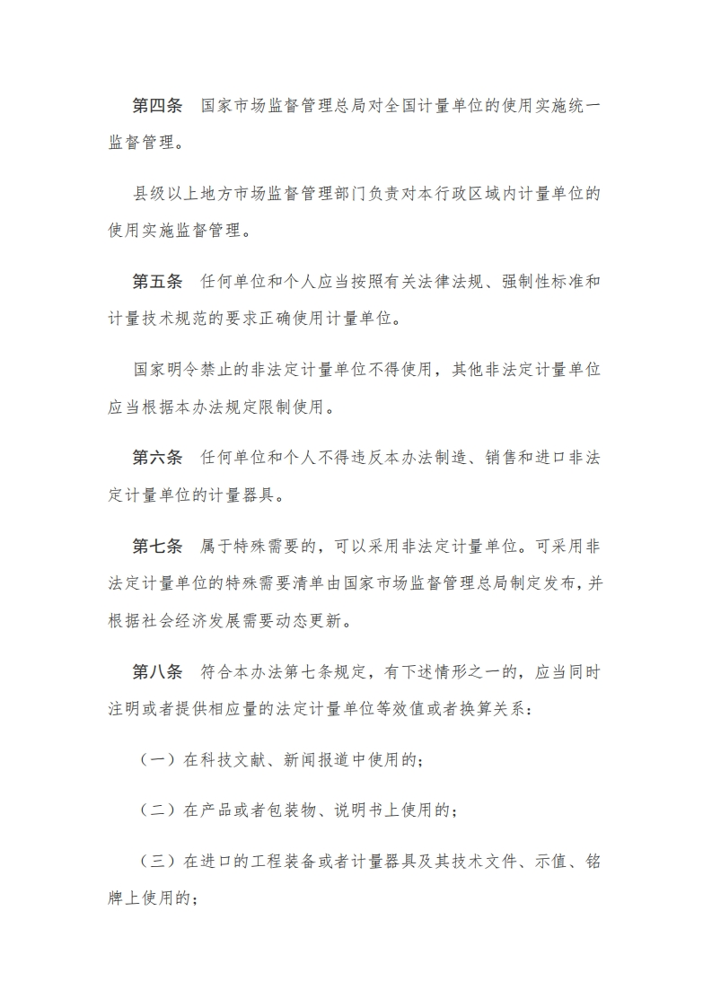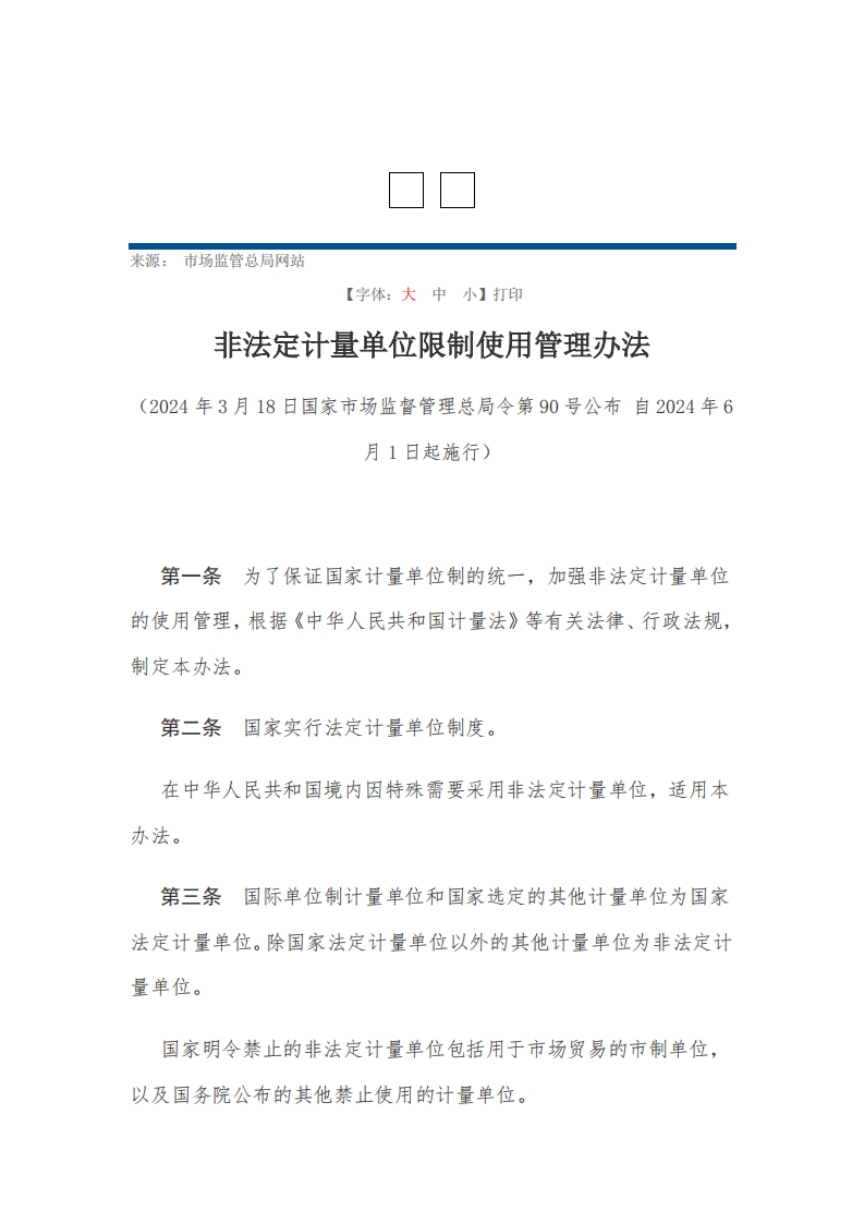 来源:市场监管总局网站【字体:大中小】打印非法定计量单位限制使用管理办法(2024年3月18日国家市场监督管理总局令第90号公布自2024年6月1日起施行)第一条为了保证国家计量单位制的统一,加强非法定计量单位的使用管理,根据《中华人民共和国计量法》等有关法律、行政法规,制定本办法。第二条国家实行法定计量单位制度。在中华人民共和国境内因特殊需要采用非法定计量单位,适用本办法。第三条国际单位制计量单位和国家选定的其他计量单位为国家法定计量单位。除国家法定计量单位以外的其他计量单位为非法定计量单位。国家明令禁止的非法定计量单位包括用于市场贸易的市制单位,以及国务院公布的其他禁止使用的计量单位。