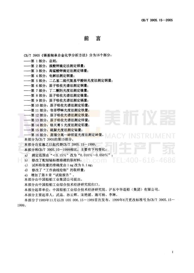 1CS77.120.60U05备案号:16175-2005中华人民共和国船舶行业标准CB/T3905.15-2005代替CB/T3905.15-1999锡基轴承合金化学分析方法第15部分:硫脲光度法测定秘量Method for chemical analysis of tin-base bearing alloyPart 15:Thiourea photometric methodfor the determination of bismuth contentHTTP://www.macylab.com TEL:400-616-46862005-04一11发布2005-07-01实施国防科学技术工业委员会发布