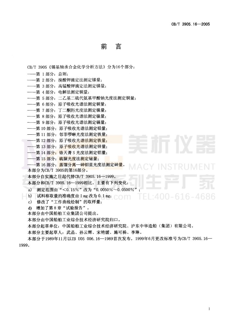 10s77.120.60U05备案号:16176-2005中华人民共和国船舶行业标准CB/T3905.16一2005代替CB/T3905.16-1999锡基轴承合金化学分析方法一第16部分:蒸馏分离-砷钼蓝光度法测定砷量CY INSTRUMENTMethod for chemical analysis of tin-base bearing alloyPart 16:Distillation-arsenic-molybdenum blue photometric methodfor the determination of arsenic content2005-04-11发布2005-07-01实施国防科学技术工业委员会发布