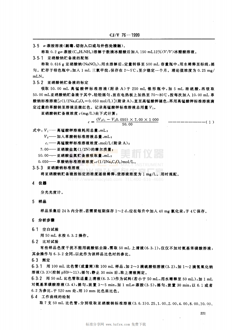 中华人民共和国城镇建设行业标准城市污水亚硝酸盐氨的测定CJ/T76-1999分光光度法Municipal sewage-Determination of nitrogen(nitrite)-Sepectrophotometric method1主题内容与适用范固本标准规定了用分光光度法测定城市污水中的亚硝酸盐氯。本标准适用于排入城市下水道污水和污水处理厂污水中亚硝酸盐氮的测定。1.1测定范固本方法测定亚硝酸盐氮的浓度范围为0.0050~0.30mg/L。1.2干扰样品中悬浮杂质及大部分金属离子的干扰,均可用硫酸铝在碱性条件下产生氢氧化铝胶体吸附沉降而消除。色度干扰可用比对试验校正。三己后自2方法原理MACY INSTRUMENT在pH≈3的醋酸溶液中,亚硝酸根与对氨基苯磺酸反应生成重氮盐,再与~蔡胺偶联成红色染料,反应式如下:NOg+H,N<⊙-S0,-H+2CH,C00H→N=N⊙S0,+2CH,C00-+2H,0NH,NH,C0+N=N-⊙-soH一O0N-N<⊙-SO,H+Ht3试剂和材料均用分析纯试剂和蒸馏水或去离子水。3.1无亚硝酸盐蒸馏水若普通蒸馏水中含亚硝酸盐,可加少许氢氧化钠,进行重蒸馏。3.2硫酸铝溶液称取18g硫酸铝[Al2(S0,)1·18H0]溶于100mL水。3.3氢氧化钠溶液称取50g氢氧化钠(NaOH)溶于100mL水。3.4对氨基苯磺酸溶液称取0.5g对氨基苯磺酸[C,H,(NHz)(SO,H)]溶于100mL12%(VW)冰醋酸溶液。中华人民共和国建设部1999-06-04批准1999-06-04实施220