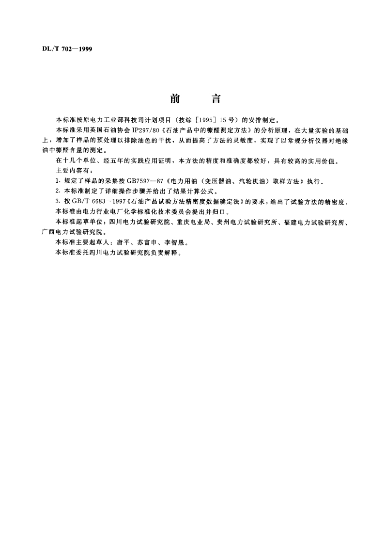 DLT702-1999矿物绝缘油中糠醛含量测定方法(分光光度法)348072@abc4个月前发布关注私信0.19MB8页020DLT702-1999矿物绝缘油中糠醛含量测定方法(分光光度法)此内容为付费资源,请付费后查看¥15¥23黄金会员免费钻石会员免费立即购买您当前未登录!建议登陆后购买,可保存购买订单付费资源 第1页 / 共8页 第2页 / 共8页 试读已结束,还剩6页,您可下载完整版后进行离线阅读 THE END标准规范 文本预览 E38备案号:6782一2000DL中华人民共和国电力行业标准DL/T702-1999矿物绝缘油中糠醛含量测定方法(分光光度法)Determination of furfural content in mineralinsulating oil by spectrophotometric method2000-02-24发布2000-07-01实施中华人民共和国国家经济贸易委员会发布 查看更多 收起部分 喜欢就支持一下吧收藏