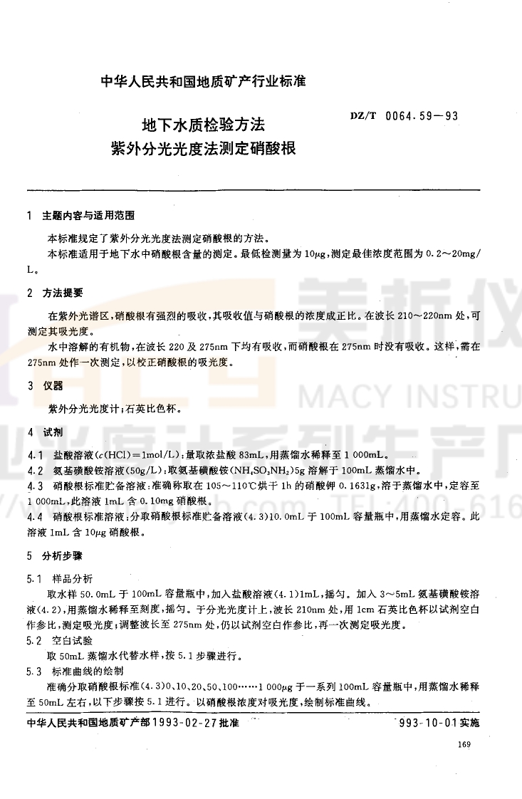 DZT0064.59-1993地下水质检验方法紫外分光光度法测定硝酸根348072@abc4个月前发布关注私信89.43KB3页049DZT0064.59-1993地下水质检验方法紫外分光光度法测定硝酸根此内容为付费资源,请付费后查看¥15¥23黄金会员免费钻石会员免费立即购买您当前未登录!建议登陆后购买,可保存购买订单付费资源 第1页 / 共3页 第2页 / 共3页 试读已结束,还剩1页,您可下载完整版后进行离线阅读 THE END标准规范 文本预览 O2中华人民共和国地质矿产行业标准DZ/T0064.10064.80-93法折地下水质检验方法MACY INSTRU光度计系列生产/www.macylab.com TEL:400-6161993-02-27发布1993-10-01实施中华人民共和国地质矿产部发布 查看更多 收起部分 喜欢就支持一下吧收藏