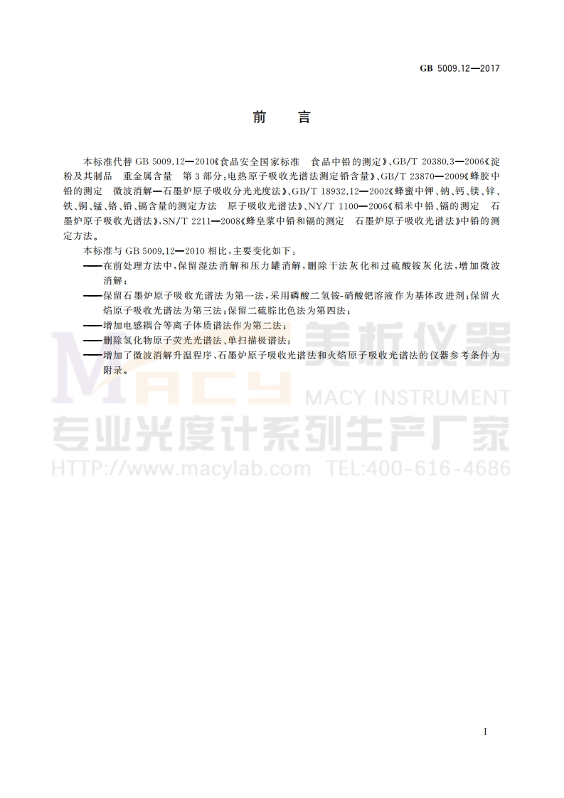 GB5009.12-2017食品安全国家标准食品中铅的测定348072@abc4个月前发布关注私信0.35MB14页050GB5009.12-2017食品安全国家标准食品中铅的测定此内容为付费资源,请付费后查看¥15¥23黄金会员免费钻石会员免费立即购买您当前未登录!建议登陆后购买,可保存购买订单付费资源 第1页 / 共14页 第2页 / 共14页 试读已结束,还剩12页,您可下载完整版后进行离线阅读 THE END标准规范 文本预览 中华人民共和国国家标准GB5009.12一2017食品安全国家标准仪器食品中铅的测定INSTRUMENT专业光度计系列生严厂家HTTP://www.macylab.com TEL:400-616-46862017-04-06发布2017-10-06实施中华人民共和国国家卫生和计划生育委员会国家食品药品监督管理总局发布 查看更多 收起部分 喜欢就支持一下吧收藏