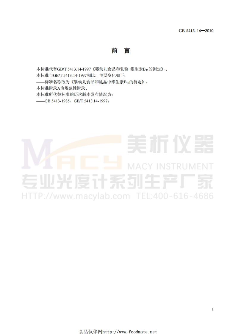GB中华人民共和国国家标准GB5413.14-2010食品安全国家标准婴幼儿食品和乳品中维生素B12的测定National food safety standardRENDetermination of vitamin Bi2 in foods for infants and young children,HTTP://www.macmilk and milk products:400-616-46862010-03-26发布2010-06-01实施中华人民共和国卫生部发布食品伙伴网http://www.foodmate.net