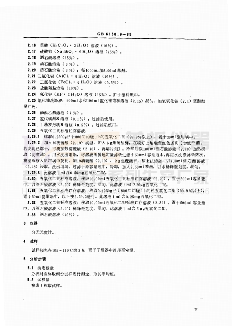 中华人民共和国国家标准钨精矿化学分析方法UDC622.346-15氯代磺酚S光度法测定铌量i543.42:546.882/.883丁基罗丹明B萃取光度法测定钽量GB6150.9-85Methods for chemlcal analysls of tungsten concentratesThe chlorosulphophenol S photometrlc method for thedetermlnadon nloblum content.The butyirhodamine B extraction photometric methodfor the determinaton tantalum content本标准适用于钨精矿中银和粗量的测定。测定范围:五氧化二锟0.01~1.00%,五氧化二钽0.005~0.250%。本标准遵守GB1467一78《治金产品化学分析方法标准的总则及一般规定》。1方法提要试样经碱熔融分解,水浸后,用磷酸络合钨,在有EDTA和草酸存在的氢氧化铵溶液中,以硅酸富集铌、钽,使其与钨、钼、锰、铝等分离。沉淀经过滤、灼烧后,用氢氟酸去硅。将铌、钼制成酒石酸溶液。在1.7N盐酸介质中,以氯代磺酚S光度法测定铌量,在8.5N疏酸介质中,以丁基罗丹明B萃取光度法测定组量。WW.nacylab.COm400-66-40662试剂2.1过氧化钠。2.2氢氧化钠。2.3丙酮。2.4氢氧化铵(比重0.90)。2.5磷酸(比重1.70)。2.6氢氟酸(比重1.15)。2.7盐酸(比重1.19)。2.8盐酸(1+1)。2.9盐酸(1+9)。2.10疏酸(比重1.84)。2.11疏酸(283+217)。2.12混合萃取剂:甲苯+丙酮=9+1。2.13乙二胺四乙酸二钠(EDTA)溶液(10%)。2.14乙二胺四乙酸二钠(EDTA)溶液(4%)。2.15氯化铵饱和溶液。国家标准局198版-06-21发布196-06-01实施26