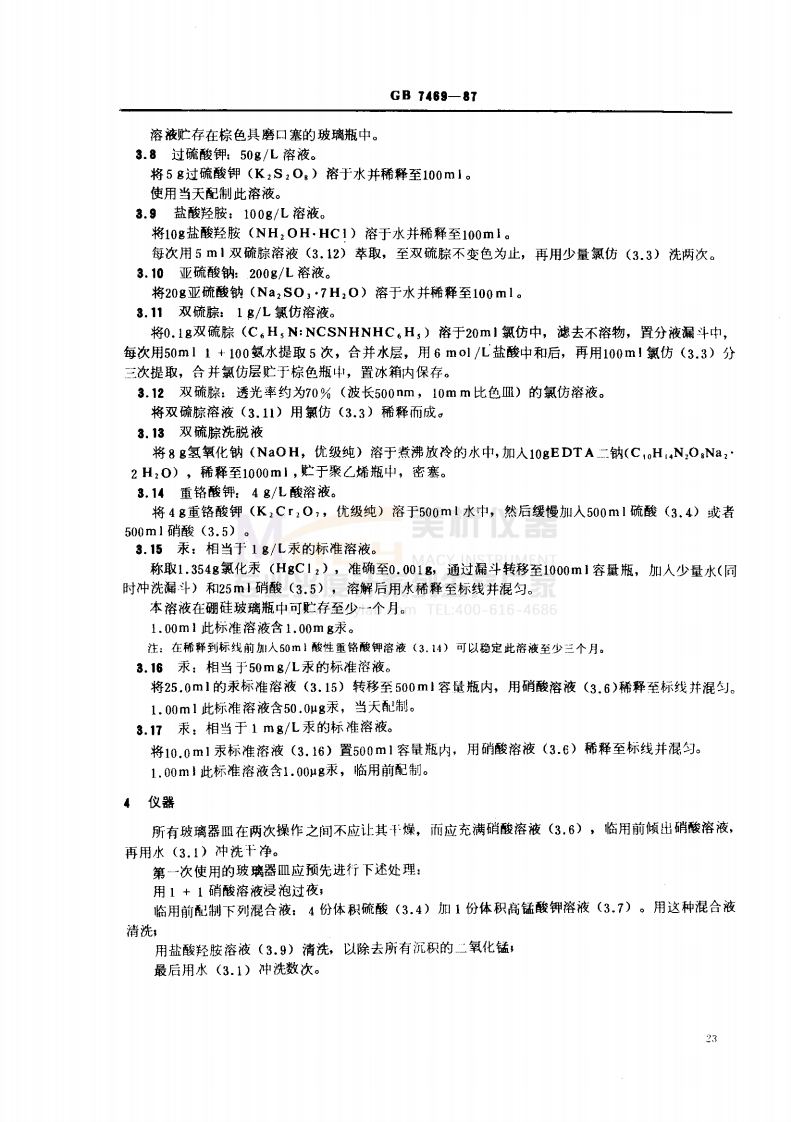 中华人民共和国国家标准水质总汞的测定UDC614,777:543.422±546.49高锰酸钾-过硫酸钾消解法GB7469-87双硫腙分光光度法Water quality-D etermination of total mercury-Potassium permanganate-potassium persalfate decomposedmethod-Dithizone spectrophotometric method本标准适用于生活污水、工业废水和受汞污染的地面水。用双硫踪分光光度法测定汞含量,在酸性条件下,干扰物主要是铜离子。在双硫腙(二苯硫代偕肼腺)洗税液中加人1%(m/Ψ)EDTA二钠(乙二胺四乙酸二钠),至少可掩蔽300Hg铜离子的干扰。本方法的摩尔吸光系数e=7.1×10L·mol-1.cm1。取250m1水样测定,汞的最低检出浓度为24g/L,测定上限为40μg/L。1定义总汞:未过滤的水样,经剧烈消解后测得的汞浓度,它包括无机的、有机结合的、可溶的和悬浮的全部汞。专业光度计系列生产厂家2原理HTTP://www.macylab.com TEL:400-616-4686在95℃用高锰酸钾和过疏酸钾将试样消解,把所含汞全部转化为二价汞。用盐酸羟胺将过剩的氧化剂还原,在酸性条件下,汞离子与双疏踪生成橙色整合物,用有机溶剂萃取,再用碱溶液洗去过剩的双疏腙。3试剂除另有说明外,分析中仅使用水(3.1)及公认的分析纯试剂,其中含汞量要尽可能少·。3.1去离子水:电阻率在500,0002·cm(25℃)以上。3.2无水乙醇(C,H,0H):优级纯。3.3氯仿(CHC1,):重蒸馏并于每100m1中加人1m1无水乙醇(3.2)作保存剂。3.4疏酸(H,S0,):P0=1.84g/ml,优级纯。3.5硝酸(HN0,):p0=1.4g/m1,优级纯。3.6硝酸:约0.8mol/L溶液。将50m】硝酸(3.5)用水稀释至1000m】。3.7高锰酸钾:50g/儿溶液。将50g高锰酸钾(KM0,,优级纯,必要时重结晶精制)溶于水并稀释至1000m1。注:制备操作要小心,避免未溶解颗粒沉淀或悬浮于溶液中(必要时可加热助溶)。·如采用的试剂导致空白试验值偏高,应改用级别更高的或经过提纯精制的试剂。国家环境保护局1987-03-14批准1987-08-01实施22