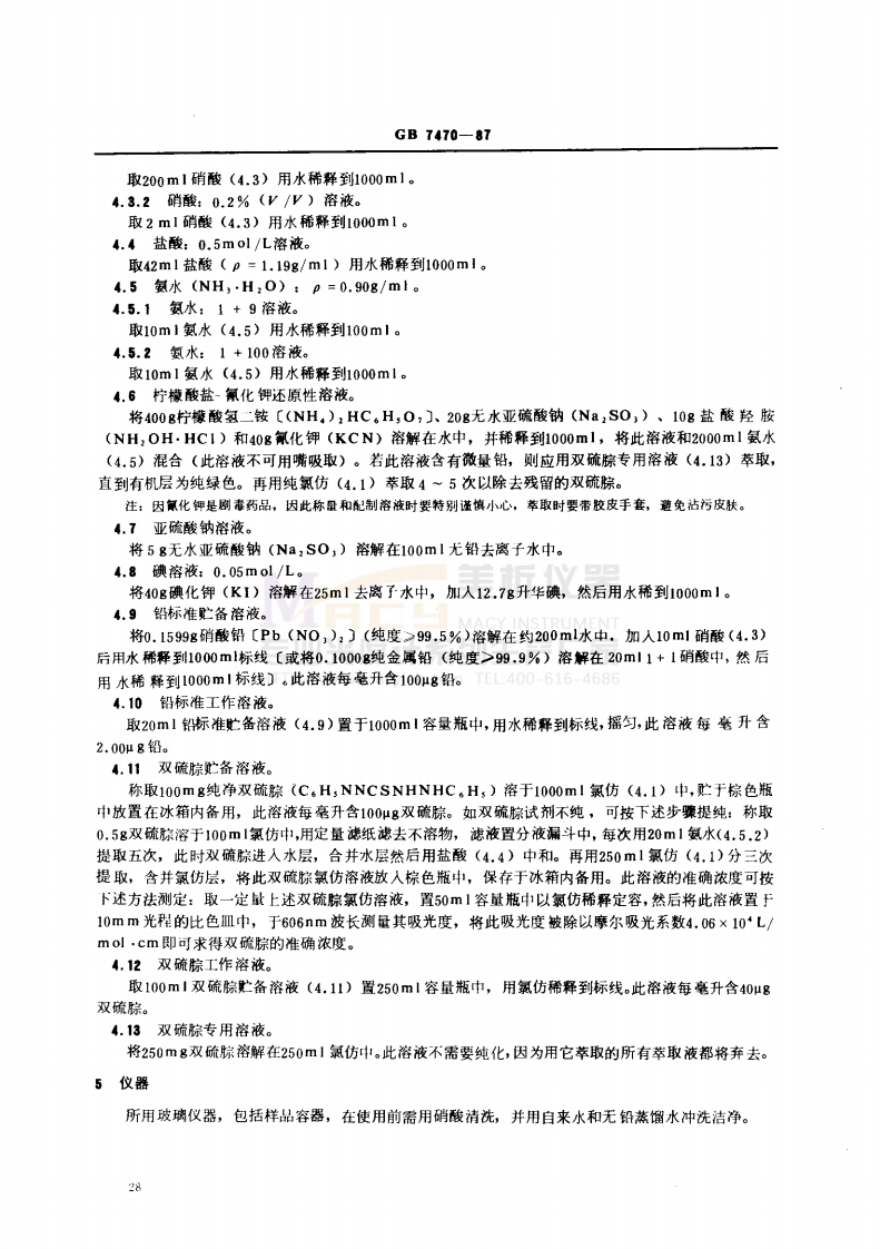 中华人民共和国国家标准UDC614.777:543水质铅的测定.42:546.815双硫腙分光光度法GB7470-87Water quallty-Determinatlon of lead-S pectrophotometric method w ith dithizone1适用范围本标准适用于测定天然水和废水中微量铅。测定铅浓度在0.01~0.30mg/L之间。铅浓度高于0.30mg/儿,可对样品作适当稀释后再进行测定。1.1检出限:当使用光程长为10mm比色皿,试份体积为100m1,用10m1双硫棕萃取时,最低检出浓度可达0.010mg/L。1.2灵敏度:用四氯化碳萃取,在最大吸光波长510nm测量时,其摩尔吸光系数约为6.7×10L/mol·cmo2定义本标准规定水样经酸消解处理后,测得水样中的总铅量。仪器3原理在PH为8.5~9.5的氨性柠檬酸盐-氰化物的还原性介质中,铅与双疏棕形成可被氯仿萃取的谈红色的双硫腙铅整合物,萃取的氯仿混色液,于510m被长下进行光度测量,从而求出铅的含量,其反应式为:IIP://www.macv.com0-616-468H CHCH,C.HN-N-HP6+十2S三CPo"C S+2H+N-N/N ZNCH,HC.h4试剂本标准所用试剂除另有说明外,均为公认的分析纯试剂。所有试剂,特别是缓冲溶液应不含铅。试验中应使用不含铅的蒸馏水或去离子水。4.1氯仿(CHC1,)。4.2高氯酸(HC10,):p=1.67g/m1,优级纯。4.3硝酸(HN0,):p=1.428/m1。4.3.1硝酸:1+4溶液。国家技术监督局1987-03-14批准1987-08-01实施27