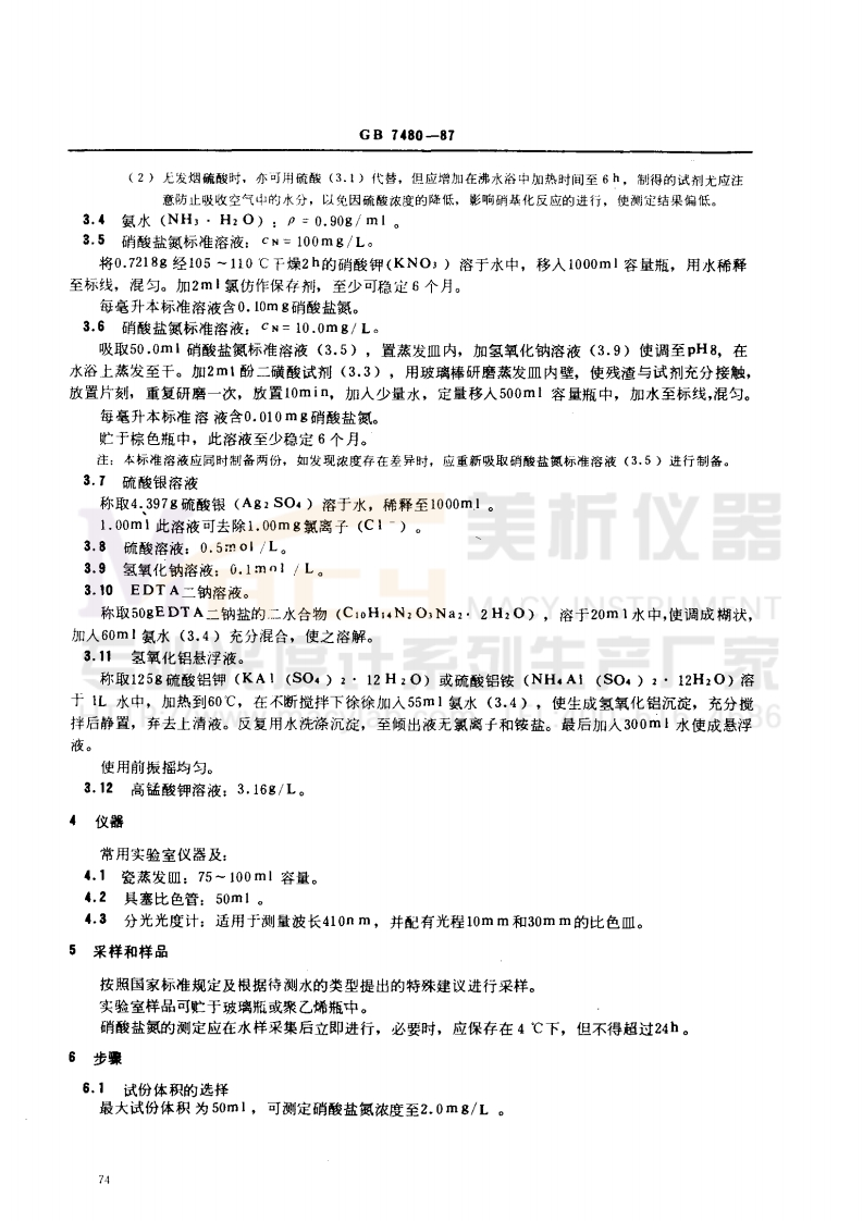 中华人民共和国国家标准UDC614.777:543.42水质硝酸盐氮的测定GB7480-87酚二磺酸分光光度法Water quality-Determination of nitrate-Spectro-photometricmethod with phenol disulfonic acid1适用范围本标准适用于测定饮用水、地下水和清洁地面水中的硝酸盐阅。1.1测定范围本方法适用于测定硝酸盐氮浓度范围在0.02~2.0mg/L之间。浓度更高时,可分取较少的试份测定。1,2最低检出浓度采用光程为30mm的比色皿,试份体积为50m1时,最低检出浓度为0.02mg/L。1.3灵敏度当使用光程为30mm的比色皿,试份体积为50m】,硝酸盐氮含量为0.60mg/L时,吸光度约0.6单位。使用光程为10mm的比色皿,试份体积为50m1,硝酸盐氮含量为2.0mg/L时,其吸光度约0.7单位。1.4千扰水中含氯化物、亚硝酸盐、铵盐、有机物和碳酸盐时,可产生干扰。含此类物质时,应作适当的前处理,以消除对测定的影响。2eVab.com TEL:400-616-46862原理硝酸盐在无水情况下与酚二磺酸反应,生成硝基二磺酸酚,在碱性溶液中,生成黄色化合物,于410nm波长处进行分光光度测定。3试剂本标准所用试剂除另有说明外,均为分析纯试剂,实验中所用的水,均应用蒸馏水或同等纯度的水。3.1疏酸:p=1.84g/m1。3.2发烟疏酸(HS04·S0,):含13%三氧化疏(S0,)。注:(1)发烟硫酸在室温较低时凝固,取用时,可先在0一50℃隔水浴中加温使熔化,不能将盛装发烟硫酸的玻璃瓶直接置人水浴中,以免瓶裂引起危险。(2)发烟硫酸中含三氧化硫(S0:)浓度超过13%时,可用疏酸(3.1)按计算量进行稀释。3.3酚二磺酸(C6H3(OH)(S0,H)2)。称取25g苯酚置于500m1锥形瓶中,加150m1疏酸(3.1)使之溶解,再加75m1发烟疏酸(3.2),充分混和。瓶口插一小漏斗,置瓶于沸水浴中加热2h,得淡棕色稠液,贮于棕色瓶中,密塞保存。注:(1)当苯酚色泽变深时,应进行蒸馏精制。国家环境保护局1987-03-14批准1987-08-01实施73
