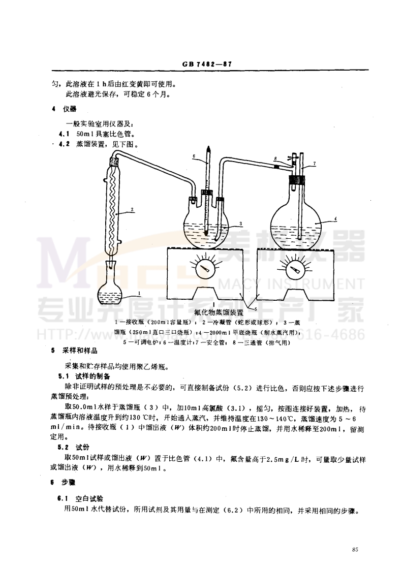 中华人民共和国国家标准UDC614.T77:543水质氟化物的测定.432:546.16茜素磺酸锆目视比色法GB7482-87Water quality-Determination of fluoride-Visual colorimetry w ithzirconlum alizarinsulfonate1适用范围本标准规定茜素磺酸锆目视比色法测定饮用水、地面水、地下水及废水中的氟化物。取50m1试样,直接测定时,本方法最低检出浓度为含氟0.05mg/L,检测上限为2.5mg/L(高含量样品可经稀释后分析)。当样品中干扰离子超过下列浓度(以mg/L计)时,需要预先蒸馏:总碱度(CaC0,)400、氯化物500、疏酸盐200、铝0.1、磷酸盐1.0、铁2.0、浊度25度、色度25度。2原理在酸性溶液中,茜素磺酸钠和皓盐生成红色络合物,当样品中有氟离子作在时,能夺取络合物中锆离子,生成无色的氟化锆离子,释放出黄色的茜素磺酸钠,根据溶液由红色褪至黄色的色度不可,与标准比色定量。3试剂除非另有说明,分析时均使用符合国家标准或专业标准的分析纯试剂和蒸馏水或同等纯度的水。3.1高氯酸(HC104):70~72%。.3.2盐酸(HC1):0=1.19g/m1。3.3硫酸(H:S0。):p=1.84g/m1。3.4亚砷酸钠(NaAs0:):5g/L。称取0.5g亚砷酸钠,溶解F少量水中,稀释至100m】。注:亚砷酸钠剧卷,防止进人口中。3.5氟化物标准溶液,含氟100.0μg/ml:取氟化钠于105℃烘2h,于下燥器中冷却后,精确称取0.2210g,用水溶解,转人1000m】容量瓶中,并用水稀释至刻度。3.6氟化物标准溶液,含氟10.00μg/m1:取10.00m】氟化物标准溶液(3.5),于100m1容量瓶中,用水稀释至刻度。3.7茜素磺酸锆酸性溶液3.7.1茜素磺酸锆溶液:称取0.3g氯氧化锆(Z0C1:·8H:0)·于100m1烧杯中,用50m】水溶解后移人1000m1容量瓶中。另称取0.07g茜素磺酸钠(CH,0,SNa·H,0)溶于50m1水中,在不断摇动下,缓慢注入氯氧化锆溶液中。充分摇动后,放置澄清。3.7.2混合酸溶液:量取101m1盐酸(3.2)用水稀释到400m1,另量取33.3m1疏酸(3.3),在不断搅拌下,缓慢加入到400m1水中,冷却后将两酸合并。3.7.3将混合酸(3.7.2)倾人盛有茜素磺酸锆溶液(3.7.1)的容量瓶中,用水稀释到刻度,摇围家环境保护局1987-03-14批准1987-08-01实施84