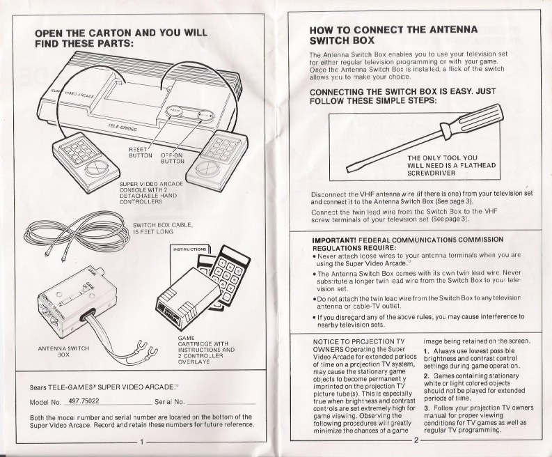 HOW TO ORDER REPLACEMENT PARTSSearsTELE-GRmES⑧M0DELN0.497.75022SLECTRONC GRMESAll parts listed herein may be ordered cirectly from any SEARS,ROEBUCKAND CO.etail or catalog store.SUPER VIDEO ARCADEWHEN ORDERING REPAIR PARTS,ALWAYS GIVE THE FOLLOWINGINFORMATION:1.Part Number3.Name of Iten2.Model NumberIf the parts are not stocked locally,your order will be electronicallytransmiited to a Sears Repair Parts Distributicn Center for expedited handling.PART NO.PART NAME2609-9599Switch Box CableOWNER'S75475Switch Box75421ControllerMANUALEXTRA SWITCH BOXESBy attaching an Antenna Switch Box to each television set in your home,you can easily move your SUPER VIDEO ARCADE from room to roam.Extra Antanna Switch boxes (part number 49-75475)are availab e throughSears,Roebuck and Co.FULL 90-DAY WARRANTY ON SUPER VIDEO ARCADEFor 90 days from date of purchase,Sears will repair th s Super Video Arcade"Tele-Garre,free of charge,if defective in material or workmanship.Warranty service is available by simply returning the Super Video ArcadeTele-Garre to the nearest Sears store throughout the United States.This warranty gives you specific legal rights,and you may also have otherrights which vary from state to state.SEARS,ROEBUCK AND CO..BSC 41-3,Sears Tower,Chicago,IL 60684"TOLL-FREE TELEGAMESB HOTLINE"Please read the Owner's Manual care'ully before using the product.If a malfunction occurs,please refer to the trouble-shooting checklist inthe Owne's Manual.If ycu cannot correct the malfunction after consultingthe trouble-shooting checklist,call the following toll-free number forassistance:(00)421-5059.Alaska,California and Hawaii residents calllllustrations:Mattel,Inc.978.PRINTED IN HONG KONG.All Rights Rasarved.direct or collec1:(213)978-6856.SEARS,ROEBUCK AND CO..Chicago,IL.606843618092032