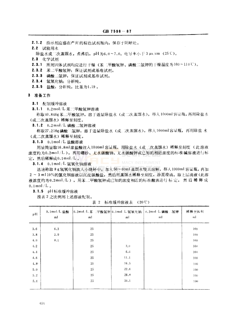 中华人民共和国国家标准LUDC621.892.098运行中变压器油、汽轮机油:543.06水溶性酸测定法(比色法)GB7598-87Determination of water-soluble acidin transformer and turbine oils inservice by colormetric method本方法适用测定运变E器油、轮机油的水溶性酸pH值。在试验条件下,试油‘等体积蒸馏水混合摇动,取其水油出液,通过比色确定其H值。1仪器1.1pH比色计:pH为3.8~7.0,间附为0.2,比色管直径为15m,容10ml。1.2比色盒:如下图。⊕田①000上出1.3能形瓶:250ml。专业光度计系列生产厂易1.4分液:250ml。P/www.macylab.com TEL400-616-46861.5温度计:0~100(。1.6水浴。2试剂2.1pH指小示剂2.1,1指小剂的制方法及变色范周见表1。表1指小示剂的制指示剂名称变色范情制方法谀甲酚球3.8-5.1将.g惧甲粉缺'7.5l0.2mL氢化钠起研,用除盐水稀释黄一蓝作25ml,序附整pH竹为1,55,1澳中酚紫6.26.8将,1g澳中M紫张于4.25ml.2ml.以北钠,用除盐水稀释黄一紫250ml。i散pfH值为6.溴白里乔粉蓝6.0、7.6将0.1g溴里香的济8.0ml.2mol」.化钠中,用除盐水稀(溴都香草酚蓝)黄蓝释25(ml。年调整H值为6.国家标准局1987-03·26批准1988-01-01实施653