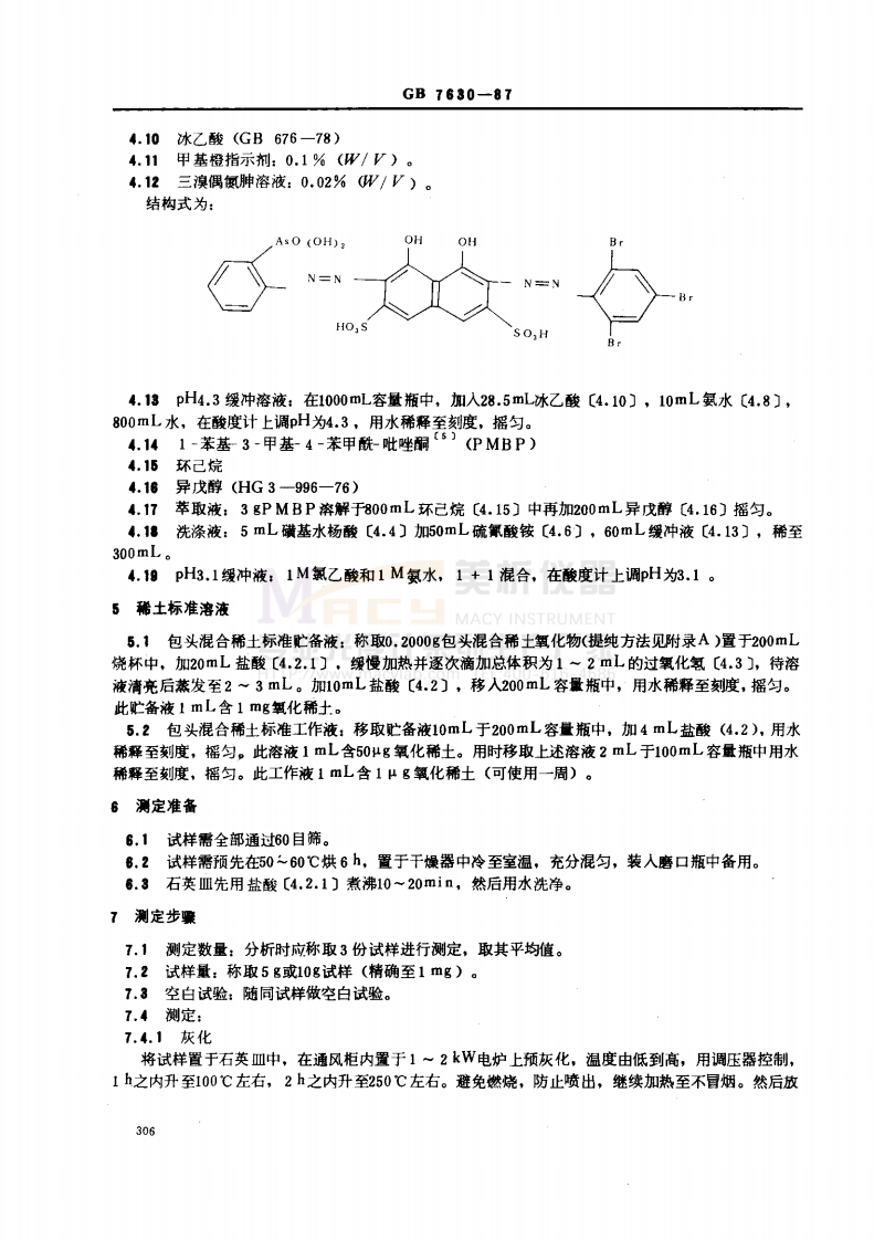 中华人民共和国国家标准大米、小麦中氧化稀土总量的测定UDC633.1:543.42三溴偶氮胂分光光度法GB7630—87The tribromoarsenazo photometri c method for thedetermination of rare earth oxidecontent In rice and wheat1适应范围本标准适用于大米、小麦中氧化稀土总量的测定。测定范围在0.5Ppm以上。2方法原理试样经灰化后,用PMBP一一异戊醇+环己烷萃取分离钙、铁等干扰元素,然后在印H3.1的氯乙酸缓冲液介质中,稀土与三溴偶胂生成蓝紫色络合物,于分光光度计波长为635nm处测量其吸光度。3仪服8.1分光光度计。美析仪器8.2酸度计。MACY INSTRUMENT3.360g“光度计系列生产厂家8.4天平1/10000g。TP://www.macylab.com TEL:400-616-46864试剂及其配制除注明者外,试剂均为分析纯,水为去离子水或燕馏水。4.1硝酸(GB626一78)4.2盐酸(GB622一77)4.2.1盐酸(6M)4.2.2盐酸(1.2M)4.2.3盐酸(0.1M)4.3过氧化氢(30%)4.4磺基水杨酸溶液:60%(W/V)。4.5抗坏血酸4.5.1抗坏血酸溶液:2%(W/V)。4.6疏氰酸铵溶液,60%(W/V)。4.7二甲基黄指示剂:0.1%乙醇溶液(W/V)。4.8氨水4.8.1氨水(7M)4.8.2氨水(1M)4.9高氯酸(GB623一77)中华人民共和围农牧渔业部1987-03-04批准1987-11-01实施305