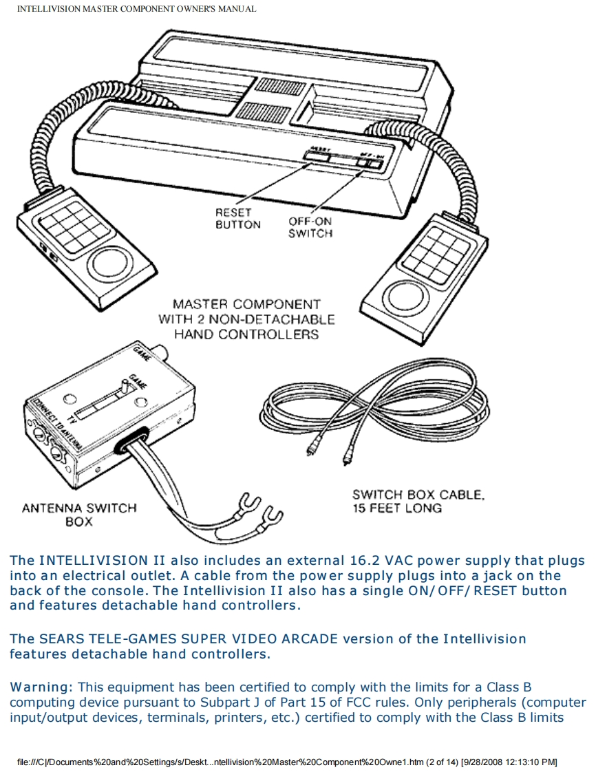 INTELLIVISION MASTER COMPONENT OWNER'S MANUALIntellivision Master Component Owner's ManualCONTENTSHow to Connect the Antenna Switchbox●Set Up Your Master Component.How to Insert the Cartridge.How to Use the Master ComponentThe Intermission Code and the Automatic Blank ScreenHow to Return Your Television Set to Regular Programming。The Hand ControllersHow to Take Care of Your Master ComponentTroubleshooting ChecklistImportant Safety InstructionsFOR COLOR TV VIEWING ONLYOPEN THE CARTON AND YOU WILL FIND THESE PARTS:file:///CDocuments%20and%20Settings/s/Deskt...ntellivision%20Master%20Component%20Owne1.htm(1 of 14)[9/28/2008 12:13:10 PM]