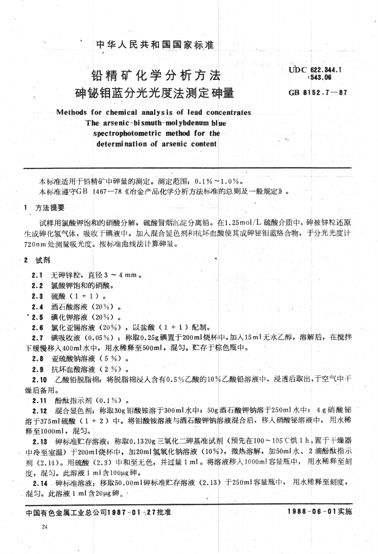 GB8152.7-1987铅精矿化学分析方法砷铋钼蓝分光光度法测定砷量348072@abc4个月前发布关注私信1.39MB6页031GB8152.7-1987铅精矿化学分析方法砷铋钼蓝分光光度法测定砷量此内容为付费资源,请付费后查看¥15¥23黄金会员免费钻石会员免费立即购买您当前未登录!建议登陆后购买,可保存购买订单付费资源 第1页 / 共6页 第2页 / 共6页 试读已结束,还剩4页,您可下载完整版后进行离线阅读 THE END标准规范 文本预览 UDC622.344.1:543.06D41GB中华人民共和国国家标准GB8152.1~8152.8-87铅精矿化学分析方法Methods for chemical analysis of lead concentrates1987-08-10发布,1988-06-01实施国家标准局发布 查看更多 收起部分 喜欢就支持一下吧收藏