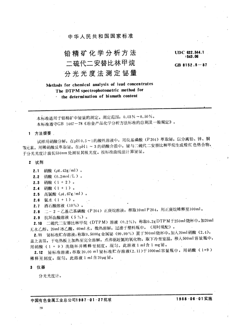 GB8152.8-1987铅精矿化学分析方法二硫代二安替比林甲烷分光光度法测定铋量348072@abc4个月前发布关注私信0.14MB5页025GB8152.8-1987铅精矿化学分析方法二硫代二安替比林甲烷分光光度法测定铋量此内容为付费资源,请付费后查看¥15¥23黄金会员免费钻石会员免费立即购买您当前未登录!建议登陆后购买,可保存购买订单付费资源 第1页 / 共5页 第2页 / 共5页 试读已结束,还剩3页,您可下载完整版后进行离线阅读 THE END标准规范 文本预览 UDC622.344.1:543.06D41种华人民共和国国家标住GB8152.1~8152.8-87铅精矿化学分析方法Methods for chemical analysis of lead concentrates1987-08-10发布1988-06-01实施国家标住局发布 查看更多 收起部分 喜欢就支持一下吧收藏