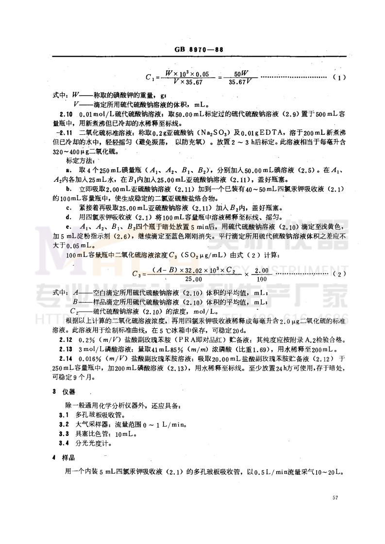 中华人民共和国国家标准UDC614.7:543空气质量二氧化硫的测定.06四氯汞盐一盐酸副玫瑰苯胺比色法GB8970-88Air quality-Determination of sulfur dioxide inambient air-Tetrachloromercurate (TCM)-pararosaniline method本方法适用于大气中二氧化疏的测定,检出限为0.15μg/5mL,可测定大气中二氧化硫浓度范围为0.015~0.500mg/m3。1原理二氧化疏被四氯汞钾溶液吸收后,生成稳定的二氯亚硫酸盐络合物,再与甲醛及盐酸副玫瑰苯胺作用,生成紫红色络合物,根据颜色深浅,比色定量。2试剂除非另有说明,分析时均使用符合国家标准的分析纯试剂和蒸馏水或同等纯度的水。2.10.04mo1/L四氯汞钾(TCM)吸收液:称取10.9g二氯化汞、6.0g氯化钾和0.07g乙二胺四乙酸二钠盐(EDTA)溶于水中,稀释至1L。此溶液在密闭容器中贮存,可稳定6个月。如发现有沉淀,不可再用。注意:四氯汞钾溶液为剧毒试剂,使用时应小心,如溅到皮肤上,立即用水冲洗。使用过的废液要集中回收,以免污染环境。2.22g/L甲醛溶液:量取1mL36~38%(m/m)甲醛溶液,稀释至200mL,临用现配。2.32/基架酸装备液称取06氨搭黄度疾HNG0AN)毫于10水中,防用现862.40.05mo1/L碘贮备液:称取12.7g碘于烧杯中,加人40g碘化钾和25mL水,搅拌至全部溶解后,用水稀释至1L,贮于棕色试剂瓶中。2.50.005mol/L碘溶液:量取50mL碘贮备液(2.4),用水稀释至500mL,贮于棕色试剂瓶中。2.62g/L淀粉指示剂溶液:称取0.2g可溶性淀粉,用少量水调成糊状物,慢慢倒入100mL沸水中,继续煮沸直到溶液澄清,冷却后贮于试剂瓶中。2.73.0g/L碗酸钾标准溶液:称取约1.5g经110℃干燥2h的碘酸钾(K1O3,.优级纯)准确到0,0001g,溶于水中,移人500mL容量瓶中,用水稀释至标线。2.81.2mol/L盐酸溶液:量取100ml浓盐酸(比重1.19),用水稀释至1L。2.90.1mol/L疏代硫酸钠溶液:称取25g疏代疏酸钠(Na2S20,·5HzO)溶于1L新煮沸但已·冷却的水中,加0.2g无水碳酸钠,贮于棕色试剂瓶中,放置一周后标定其浓度,若溶液呈现浑浊时,应该过滤。标定方法:吸取25.00mL碘酸钾标准溶液(2.7)置于250mL碘量瓶中,.加70mL新煮沸但巳冷却的水,加1g碘化钾,振荡至完全溶解后,再加10mL盐酸溶液(2.8),立即盖好瓶塞、,混匀。在暗处放置5min后,用疏代硫酸钠溶液滴定至淡黄色,加5mL淀粉指示剂(2.6),继续滴定至蓝色刚好褪去。疏代疏酸钠浓度C,(mol/L)按式(1)计算:国家环境保护局1988-03-26批准1988-08-01实施56
