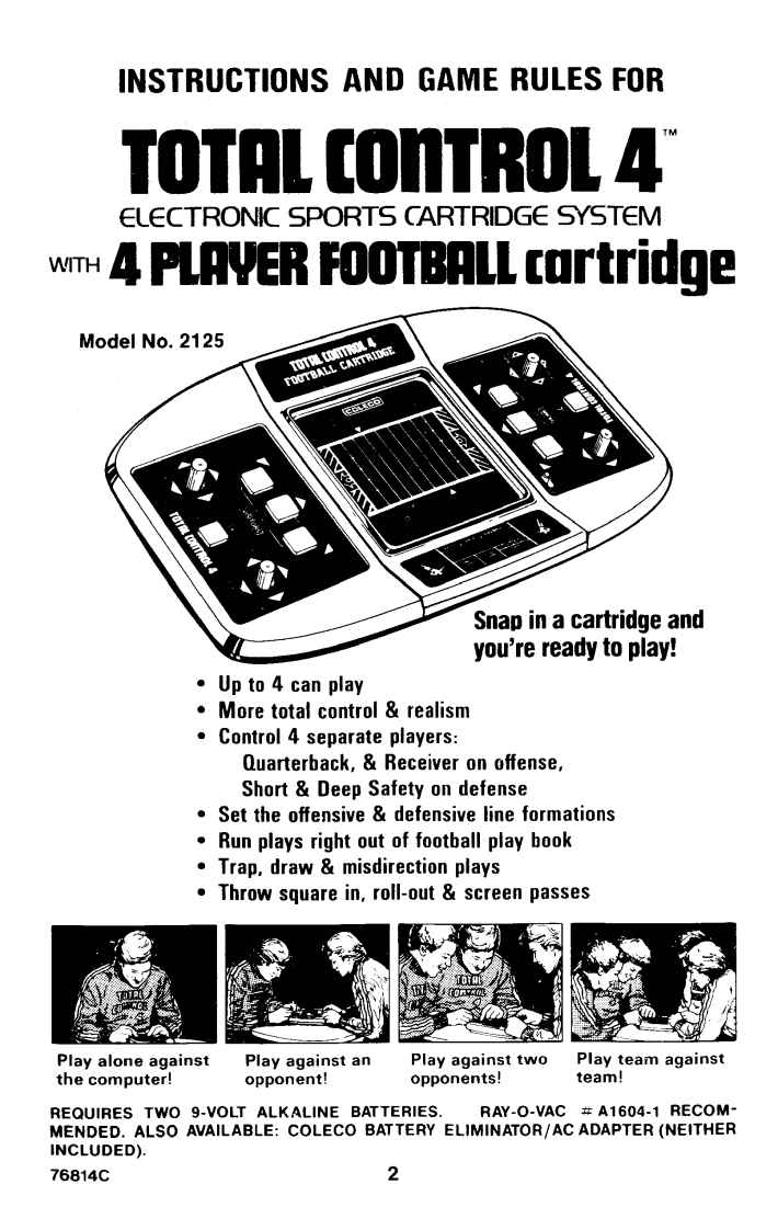 GOL三GaGuide No.76814CTOTAL CONTROL 4ELECTRONIC SPORTS CARTRIDGE SYSTEMINSTRUCTIONSFor Ages 8 to AdultANDGAME RULEStT0m春FOOTBALL CARTRIDGE8c5◆◆TOrAL (ONTROL 4NOCKEY CARTRIDGEIOTWL IONTROL 4BASKETBALL CARTRIOGETOTRL CORTROL 4SOCCER CARTRIDGETOTAL CONTROL 4TM is an ADVANCED-LEVEL sports game that is designed togive you hours of exciting and challenging play.Like the real sports themselves,TOTAL CONTROL 4TM requlres practice and skill to master.To become a "pro",read the instructions and Play Book carefully,then start with skill level 1 and theeasier plays and work your way up to skill level 2 and the more complex plays.Bepatient,and take the time to master TOTAL CONTROL 4TM-you'll find it'sworth it!COLECOMANUFACTURED FOR COLECO INDUSTRIES,INC.,AMSTERDAM,N.Y.12010c 1981,Coleco Industries,Inc.Patent Pending