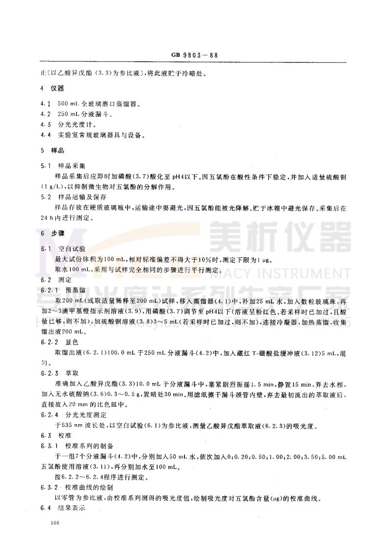 中华人民共和国国家标准UDC614.777:543水质五氯酚的测定,42.06藏红T分光光度法GB9803-88Water quality-Determination of pentachiorophenolby safranine-T spectrophotometric method1适用范围本标准适用于含五氯酚工业废水以及被五氯酚污染的水体中五氯酚的测定。其测定浓度范围为0.01一0.5mg/L:挥发酚类化合物(以苯酚计)低于150mg/L对测定无千扰。最低检出浓度为0.01mg/L2原理用蒸馏法蒸馏出五氯酚,从而与高沸点酚类和其他色素等干扰物分离.被蒸馏出的五氯酚在硼酸盐级冲液(pH9.3)存在下,可与藏红T生成紫红色络合物,用乙酸异戊酯萃取,置于波长535nm下,满定吸光度。MACY INSTRUMENT试剂本标准所用试剂除另有说明外,均为分析纯试剂.所用的水指蒸馏水或具有同等纯度的去离子水。3.1五氯酚(CClOH),化学纯。HT3.2藏红T(Safranine-T),编号82555,染料。0mTEL:400-616-46863.3乙酸异戊酯(CH;COOC6H:),3.4四硼酸钠(NaB,O,·I0Hz0)。3.510%(m/P)氢氧化钠溶液。3.6无水硫酸钠。3.7磷酸(HgP04)p=1.70g/mL(85.0%).3.810%(m/W)疏酸铜溶液。3.90.1%(m/W)甲基橙指示剂溶液(methyl orange).。3.10五氯酚贮备液:准确称取五氟酚(3.1)0.5000g于小烧杯中,逐滴加入氢氧化钠溶液(3.5)10mL,边加边搅拌,然后,加入少量水,使之全部溶解后,移入500mL棕色容量瓶中,并用水稀释至标线。其浓度为1.000mg/L,置冰箱内,避光保存。3.11五氯酚使用溶液取五氯酚贮备液(3.10)1.00mL于100mL棕色容量瓶中,加水至标线,其浓度为0.010mg/mL,临用时配制。3.12藏红T-硼酸盐缓冲液称取0.1g藏红T(3.2),19.1g四硼酸钠(3.4)共溶于水中,并稍微加热至全溶,稀释至1000mL.每次用30一50mL乙酸异戊酯(3.3)反复萃取,弃去有机相,直至乙酸异戊酯萃取液的透光率约为93%为国家环境保护局1988-08-15批准1988-12-01实施165