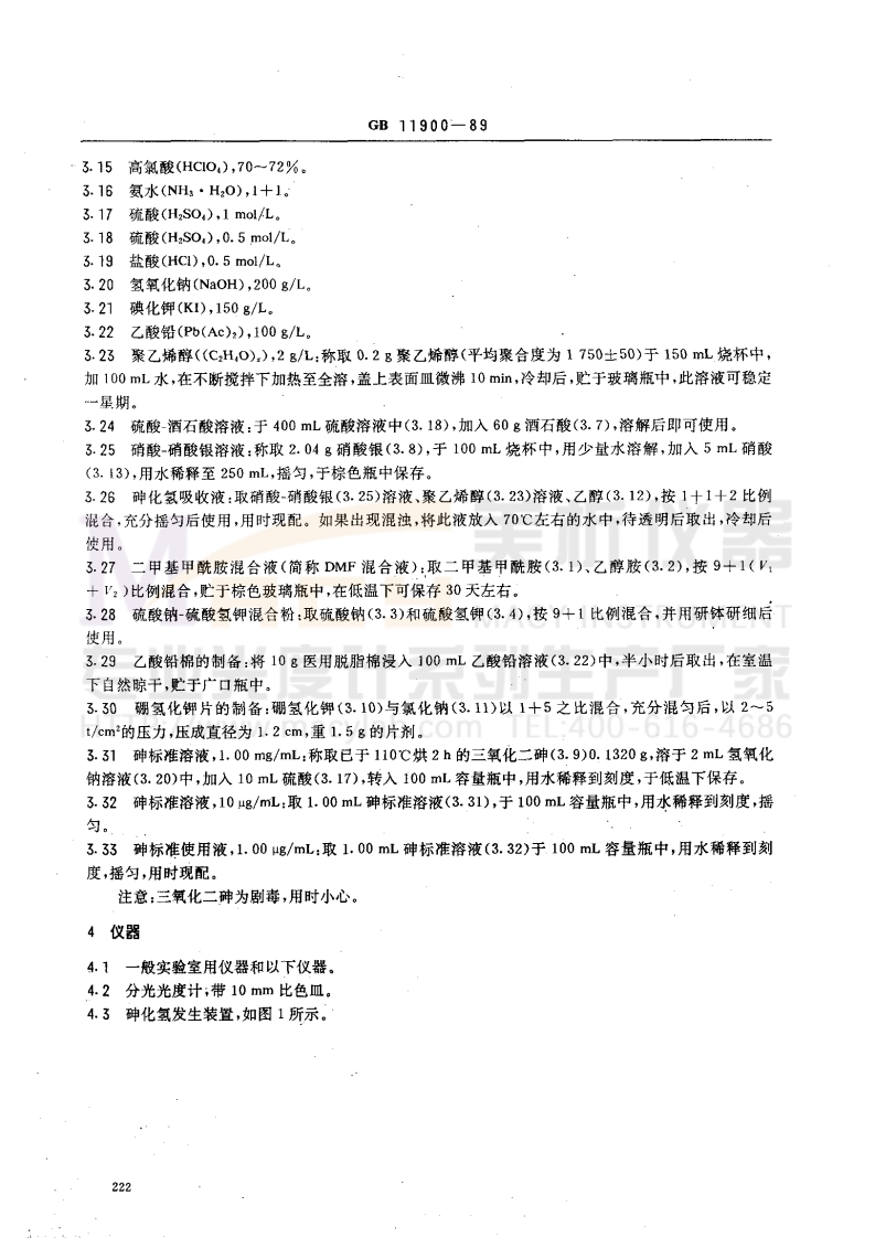 中华人民共和国国家标准水质。,痕量砷的测定硼氢化钾-硝酸银分光光度法GB11900-89Water quality-Determination of traceamounts of arsenic-Spectrophetometricmethod with silver salt1主题内容与适用范围本标准规定了用新银盐分光光度法测定地面水、地下水和饮用水中痕量砷,取250mL试料3.00mL吸收液,用10mm比色皿,本方法最低检出浓度为0.4g/L,测定上限为12g/儿。2原理硼氢化钾(或硼氢化钠)在酸性溶液中产生新生态的氢,将试料中砷转变为碑代氢、用硝酸硝酸银聚乙烯醇-乙醇溶液为吸收液,将其中银离子还原成单质银,使溶液呈黄色,在400nm处测量吸光度。化学反应式如下:BHT+H++3H2O--8CH]++-H3BO;MACY INSTRUMENT2As++6CHD→2AsH,↑6Ag十AsH2+3H,0+6Ag十H3AsO,+6H+系列生产厂家3试剂本标准所用试剂,除特殊规定外,均使用符合国家标准或专业标准的分析纯试剂和蒸馏水或同等纯度的水。3.1二甲基甲酰胺(HCON(CH3)z).3.2乙醇胺(CHNO)。3.3硫酸钠(NaS0,),无水3.4硫酸氢钾(KHSO),固体。3.5抗坏血酸(CHO),固体。3.6疏脉(NHz)CS),固体。3.7酒石酸(CH0),固体。3.8硝酸银(AgNO),固体。3.9三氧化二神(As2O),固体。3.10翻氢化钾(KBH,),固体。3.11氯化钠(NaC1),固体。3.12乙醇(CHCH0H),无水或95%。3.13硝酸(HN0),p=1.40g/mL。3.14盐酸(HC1),p=1.19g/mL。国家环境保护局1989-12-25批准1990-07-01实施221