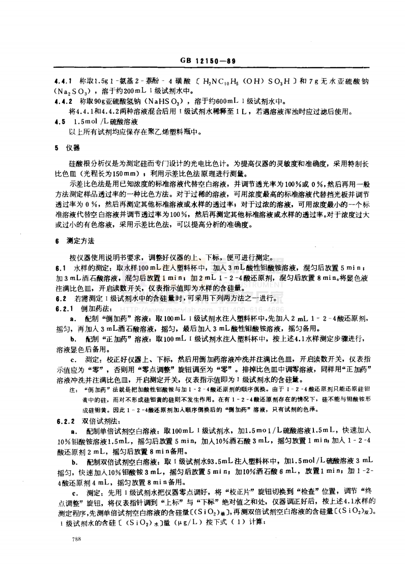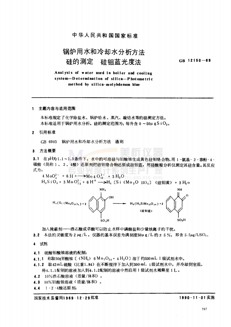 中华人民共和国国家标准锅炉用水和冷却水分析方法硅的测定硅钼蓝光度法GB12150-89Anal ysis of water used in boiler and coolingsystem-Determination of silica-Photometricmethod by silica-molybdenum blue1主题内容与适用范围本标准规定了化学除盐水、锅炉给水、蒸汽、凝结水等的硅测定方法。本标准适用于锅炉用水分析。硅的测定范围为:每升含0~50μgSiO2。2引用标准GB6903锅炉用水和冷却水分析方法通则3方法概要3.1在pH为1.1~1.3条件下,水中的可溶硅与钼酸铵生成黄色硅钼络合物,用1-氨基-2~萘酚-4-磺酸(简称1、2、4酸)还原剂把硅钼络合物还原成硅钼蓝,用硅酸根分析仪测定其硅含量。其反应式为:4Mo0?+6H+>M0403+3H,0H,SiO,+3MoO,+6H+>H4〔Si(Mo010)4】(硅钼黄)+3H0NHzNHOHH,(Si(Mo,0o4)+2(硅朝蓝)SO,HSO:H加人掩蔽剂一酒石酸或草酸可以防止水样中磷酸盐和少量铁离子的干扰。3.2本法的灵敏度为2g/L,仪器的基本误差为满刻度50μg/L的±5%,即含2.5g/LS1O2。4试剂4.1疏酸钼酸铵溶液的配制:4.1.1称取50g酸铵〔(NH)6Mo,O24·4H20〕溶于约500mLI级试剂水中。4.1.2取42mL硫酸(比重1.84)在不断搅拌下加入到300mL1级试剂水中,并冷却到室温。将4.1.1配制的溶液加人到4.1.2配制的溶液中然后用1级试剂水稀释至1L。4.210%酒石酸溶液(质量/体积)。4.310%酸铵溶液(质量/体积)。4.4】-2-4酸还原剂:国家技术监督局1989-12-29批准1990-11-01实施787