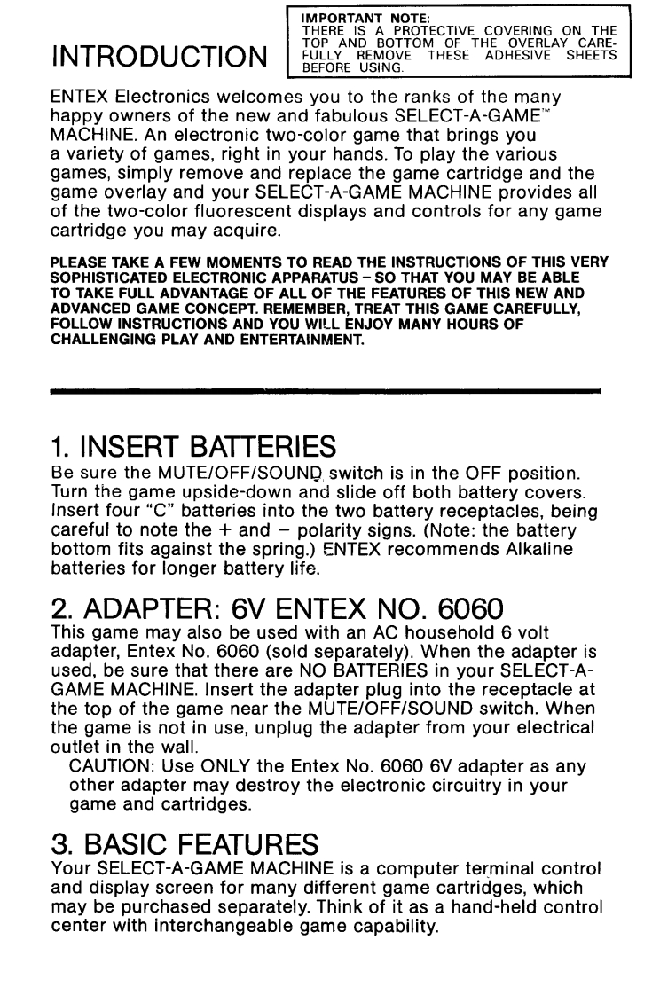 N0.6030ELECTRONIC COLORENTEXELECTRONICSS王LET☆A☆GAMEMACHINEINTERCHANGEABLE CARTRIDGE GAME SYSTEMENTEXHAND-HELD GAMEOONE-ON-ONEPLAYERGAME2/1/DEMOACSKILLDIRECTIONAL1/2ADAPTERMUTE/OFF1/2CONTROLSJACKSOUND2-COLORFLUORESCENTDISPLAYINTERCHANGEABLEOVERLAYHOMESIDEGAME PLAYCONTROL S0NSELECTGAME PLAYCONTROLSMACHINEOVERLAYFRAMEDIRECTIONALCONTROLSVISITORSIDEENTEX SELECT-AGAMECARTROGECARTRIDGECARTRIDGELABEL1981 Entex Industries,Inc.Compton,CA 90220Patent Pending Printed in Taiwan